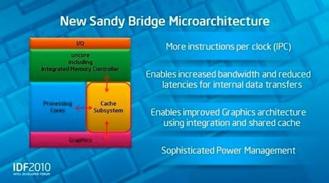 Sandy Bridge: микроархитектура Intel следующего поколения Автор: Олег Нечай Опубликовано 03 сентября 2010 года В первом квартале 2011 года Intel планирует представить новую микроархитектуру центральных процессоров, известную под кодовым названием Sandy Bridge ("песчаный мост"). Это будет не просто очередная модернизация, а принципиальный шаг вперёд, как это было с Conroe и сегодняшней Nehalem. Официальная презентация Sandy Bridge ожидается на осеннем Форуме Intel для разработчиков (IDF Fall 2010), который пройдёт с 13 по 15 сентября в Сан-Франциско, мы же познакомим вас с той информацией о новой архитектуре, которая известная уже сегодня. О самой микроархитектуре Sandy Bridge пока известно не слишком много, но даже по имеющейся информации можно оценить, насколько она отличается от Nehalem. Главное и принципиальное отличие заключается в том, что Sandy Bridge - это процессор с графическим ядром на одном кристалле, в то время как в современных Clarkdale и мобильных Arrandale ГП устанавливается на одной плате под единой крышкой с ЦП. Кроме того, Sandy Bridge будут выпускаться по 32-нм технологии, в то время как нынешние Core производятся по 45-нм технологическому процессу. Интегрируемый в ЦП графический процессор будет выпускаться в двух вариантах: условно одно- и двуядерном - первый состоит из шести универсальных процессоров или, в терминологии Intel, исполнительных блоков (execution units, EU), второй - из двенадцати. В современные чипы Core i3/i5 (Clarkdale и Arrandale) встраивается графическое ядро с 12 EU, при этом как утверждают в Intel, новый вариант ГП будет примерно вдвое производительнее. Номинальная тактовая частота графического ядра составит 850 МГц. Интересно, что технология автоматического разгона Turbo Boost будет реализована как в ЦП, так и в ГП, причём изменение частот ядер будет осуществляться независимо. К примеру, если для сложных вычислений требуются мощности центрального процессора, то будет увеличиваться именно его частота, а в играх, наоборот, будет повышаться частота графического ядра (до 1100-1350 МГц), не затрагивая частоты ЦП. Такая схема даст определённую гибкость при оптимизации тепловыделения, поскольку одновременно разогнанные ядра существенно повысили бы максимальный термопакет. В Intel не намерены отказываться от марки Core, и Sandy Bridge будет официально считаться вторым поколением микроархитектуры Core. С этим связаны некоторые изменения в наименованиях процессоров - новые модели должны чётко отличаться от старых. Для этого перед цифровым индексом каждой модели будет стоять цифра "2", обозначающая второе поколение. Для примера возьмём чип Intel Core i5-2500K. Здесь "Intel Core" - это марка, "i5" - серия, "2" - поколение, "500" - индекс модели, а "K" - буквенный индекс. На буквенных индексах стоит остановиться подробнее. По нынешнему поколению Core известен один из них - это "S" (процессоры i5-750S и i7-860S). Он присваивается чипам, ориентированным на домашние мультимедийные машины. Процессоры с одинаковым числовым индексом отличаются тем, что модели с буквенным индексом "S" работают на чуть меньшей номинальной тактовой частоте, но «турбочастота», достигаемая при автоматическом разгоне Turbo Boost, у них одинакова. Иными словами, в штатном режиме они экономичнее, а их система охлаждения тише, чем у "стандартных" моделей. Все новые дектопные Core второго поколения без индексов потребляют 95 Вт, а с индексом "S" - 65 Вт. Модификации с индексом "T" работают на ещё более низкой