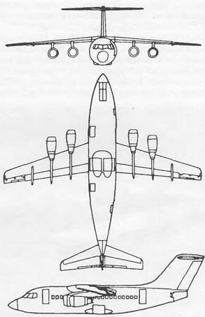 ВАе HS 146 STA ВОЕННО-ТРАНСПОРТНЫЙ САМОЛЕТ Предназначен для перевозки военных грузов. Разработку нового транспортного самолета малой дальности компания «Хоукер Сиддли» начала в августе 1973 г. Первоначальный вариант получил обозначение HS 146-100 и его первый полет должен был состояться в декабре 1975 г., но этого не произошло из- за известного экономического кризиса осенью 1974 г., а в апреле 1977 г. компания «Хоукер Сиддли» была поглощена корпорацией ВАе, решившей продолжить программу. Первый опытный самолет HS 146-100 был построен в конце мая 1981 г. Первый полет состоялся 3 сентября 1981 г. Летные испытания опытного самолета HS 146-200, который отличался удлиненным на 2,39 м фюзеляжем, начались 1 августа 1982 г. Военный вариант HS 146STA на базе HS 146-100 имеет боковые двери для погрузочно-разгрузочных работ, которые обеспечивают выброску грузов парашютным способом, а также систему дозаправки топливом в воздухе. Самолет HS 146 представляет собой свободно- несущий высокоплан с конструкцией из легких сплавов, фюзеляжем круглого сечения диаметром 3,56 м и четырьмя турбореактивными двигателями на пилонах под крылом Конструкция планера рассчитана на 55000 полетов. Крыло самолета высокорасположенное двух- лонжеронное Конструкция цельнометаллическая, безопасно повреждаемая. Обшивка верхней и нижней поверхности каждой консоли крыла монолитная, подкрепленная стрингерами. Фюзеляж самолета типа полумонокок, круглого поперечного сечения, полностью герметизирован Трехопорное шасси имеет спаренные колеса на каждой стойке, тормоза с высокой энергоемкостью и автоматами антиблокировки. Силовая установка самолета HS 146-100 состоит из четырех двигателеи с большим коэффициентом двухконтурности и малым уровнем шума Выбор типа силовой установки и количества двигателей был обусловлен необходимостью обеспечения эксплуатации самолета с коротких полуподготовленных взлетных полос в условиях жаркого климата, выполнения полета с одним неработающим двигателем, пролета над препятствием в конце ВПП и достижения безопасной скорости набора высоты. Самолет оснащен радионавигационным оборудованием, позволяющим совершать полеты в зонах с интенсивным воздушным движением, а также в районах, где отсутствуют наземные навигационные пункты. В состав автоматизированной системы управления полетом (AFGS) входит автопилот Смит SEP 10, с помощью которого возможен автоматический заход на посадку в условиях погодного минимума по первой категории (высота принятия решения 60 м). Предусмотрена возможность сертификации по второй категории (высота принятия решения 30 м). На самолете установлены также навигационные системы VOR/ILS и DME. Грузовой пол кабины рассчитан на нагрузку массой 10 т. В хвостовой части фюзеляжа находится грузовая дверь размером 2,92x1,98 м. Самолет может перевозить шесть стандартных грузовых платформ размером 2,74x2,24 м и одну платформу с уменьшенными вдвое размерами. ТАКТИКО-ТЕХНИЧЕСКИЕ ХАРАКТЕРИСТИКИ Экипаж, чел. 2 Скорость крейсерская, км/ч 709 Дальность, км. перегоночная 2872 действия 1850 Масса, кг: максимальная взлетная 36628 пустого самолета 20670 Максимальная полезная нагрузка, кг 8620 Длина разбега (при нормальной взлетной массе), м 990 Длина пробега (при нормальной посадочной массе), м 1020 Габариты самолета, м, размах крыла 26,34 длина 26,16 высота 8,61 Двигатель: ТРДД Avco Lycoming ALF-502R-3, кгс 4 по 3039 |