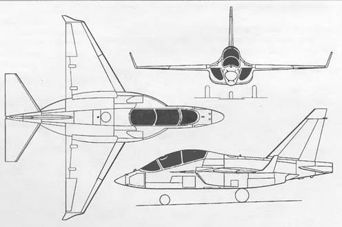 Як-130 УЧЕБНО-ТРЕНИРОВОЧНЫЙ САМОЛЕТ (ПРОЕКТ) Предназначен для подготовки летного состава фронтовой авиации и к 2000 г должен заменить находящиеся в эксплуатации устаревшие самолеты L-39. Запуск самолета в серию намечался на 1998 г. Як-130 (первоначальное обозначение УТС-Як) разрабатывается совместно с итальянской фирмой «Аэрмакки» и входит в состав учебно-тренировочного комплекса, включающего также дисплейные классы, процедурные и функциональные тренажеры, а также самолет Як-54 для начальной подготовки. Первый полет опытного Як-130 состоялся в 1995 г. Как модификация разрабатывается Як-130Д – демонстрационный образец, который по конфигурации и системе управления будет близок к серийной версии машины На основе базового учебно-тренировочного варианта создается палубный учебно-тренировочный самолет, снабженный складным крылом, усиленными стойками шасси и тормозным гаком, а также экспортный одноместный ударный вариант, имеющий усилен ное вооружение и оснащенный бортовой РЛС. Як-130 выполнен по нормальный аэродинамической схеме с крыльями, имеющими развитые наплывы и концевые шайбы, и размещенными под ними воздухозаборниками. Кабина с тандемным расположением сидений и фонарем. Гарантированный безопасный ресурс планера – 10000 ч; он может быть увеличен до 15000 ч, что примерно соответствует выполнению 20000 посадок и календарному сроку службы 30 лет. На самолете установлены 2 ТРД с цифровой системой управления. Электродистанционная трехканальная система управления полетом имеет четырехкратное резервирование с ограничением опасных режимов и обладает возможностью перепрограммирования характеристик устойчивости и управляемости для имитации поведения тяжелого самолета и маневренного истребителя. Самолет оборудован инерциальной навигационной системой, радионавигационной системой, радиовысотомером, приемником спутниковой навигационной системы. Основной отличительной особенностью самолета является наличие системы объективного контроля как бортового оборудования, так и действий летчиков. Предусмотрен контроль видеокамерой положения рук летчиков, их глаз, внутри- и внекабинного пространства. На видеомагнитофон также постоянно записывается информация об индикации на ИЛС. Для отработки действий по воздушным целям используется лазерная пушка-имитатор, а также приемники лазерного излучения. Компоновка приборных досок и пультов близка к истребителям четвертого и пятого поколений. Акцент сделан на реализацию тренировочных задач с имитацией применения оружия в условиях игрового движения целей, изменения помеховой обстановки, с возможностью анализа и разбора ошибок непосредственно в полете и воспроизведения полета на наземном тренажере. Установлены катапультные кресла К-36. Приборные доски инструктора и курсанта могут оснащаться двумя многофункциональными экранными индикаторами. В кабине курсанта установлен ИЛС. Возможно использование нашлемной системы индикации. На семи внешних узлах могут подвешиваться пушечные установки, управляемые ракеты, корректируемые и обычные бомбы. Высокая эффективность применения Як-130 обусловлена следующими показателями: • уникальными для учебного самолета маневренными качествами, позволяющими реализовать перегрузку установившегося виража более 5 g на высоте 4500 м и скорости 700 км/ч, а радиу
