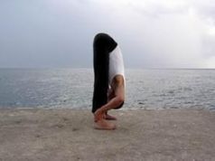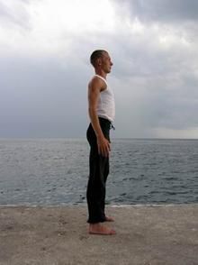АсаныСвязка 1. Первое малое Солнечное кольцоПервый динамический блок асан Исходное положение – ноги вместе (в том случае, если тренировка приходится на первую половину дня) или на ширине плеч (тренировка во второй половине дня). Стопы параллельно друг другу, таз подобран, позвоночник вытянут вверх, подбородок слегка втянут, плечи расправлены движением из центра грудной клетки – не физкультурная стойка «смирно», а естественное расширение для создания свободного пространства в центре. Вес тела свободно проводится в землю, стопы как бы растекаются под тяжестью всего тела, стоим на костях, все тело полностью расслаблено. (ДБ-1-1). Не забываем о цели, которую ставим перед собой на данный момент и достижению которой готовы посвятить эту тренировку, максимально усиливаем ее итоговый образ. Внимание уходит вниз, к центру земли, подошвы стоп как бы растворяются, мы срастаемся с землей. Поднимаем вдох из земли вверх, отмечаем уровень, до которого докатилась его волна, выдох опускаем в землю, новый вдох стараемся провести выше, выдох – в землю, вдох – еще выше… Даже если и не получилось сразу, в конце концов очередная волна вдоха не остановится в голове, а уйдет куда-то в бесконечность вверх. Выдох – снова в землю, максимально раскачиваем этот маятник, интенсивность прохождения волн можно усилить гипервентилляционными техниками по типу бхастрики или капалабхати-пранаямы . Формируем легкий корневой замок. На бесконечной прямой, которую мы отстроили вертикальной прокачкой структуры, вниманием находим свой центр – мечевидный отросток у основания грудины, там, где сходятся реберные дуги. Не теряя ощущения осевых потоков, делаем несколько вдохов-выдохов из центра всей поверхностью тела, уплотняя его внутренний объем. ![]() (ДБ– 1-1) ![]() (ДБ– 1-2) 1. Движением из центра через стороны поднимаем руки, вытягивая их в бесконечность справа и слева, как бы разглаживая пространство вокруг и одновременно «зачерпывая» его. Руки плавно сходятся над головой, сжимая «зачерпнутое» пространство во что-то очень плотное, в какой-то момент все это соберется в области копчика. (ДБ: 1-1,1-2). Если сразу не получится отследить все это на уровне ощущений, ничего страшного, однажды вы сами поймете, что все это очень естественно и было всегда, просто на это не обращалось внимания. Для начала достаточно координировать движения внимания, дыхания и тела, именно в такой последовательности. Вдох – руки расходятся в стороны, стараемся разгладить пространство и зачерпнуть его, пауза после вдоха – внимание уходит в копчик… ![]() (ДБ– 1-3) 2. С выдохом руки через стороны опускаются вниз: мы пытаемся «зачерпнуть» пространство над собой и стянуть его вниз, вторая фаза движения – наклон вперед волнообразным движением из копчика вдоль позвоночника в голову. Стараемся не просто «сложиться» пополам, дотянувшись головой до ног, а именно – вытянуться вниз, стремясь дотянуться головой до стоп, в идеале позвоночник остается прямым, складывание происходит в тазобедренных суставах. Волна прокатывается из копчика в голову. (ДБ-1-3). ![]() (ДБ– 1-4) 3. Внимание уходит в межбровье, подхватываем волну головой и с выдохом прогибаемся: межбровье вытягиваем вперед, плечи – вверх, позвоночник прогнут, живот стремится к бедрам, ладони – на полу перед стопами. Внимание скользит обратно в копчик. (ДБ-1-4). ![]() (ДБ– 1-5)