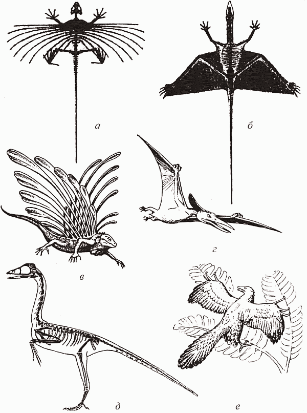 ГЛАВА 11Поздний мезозой: эволюция наземных позвоночных (2). Завроморфный мир. Маммализация териодонтов. Динозавры и их вымирание Итак, мы знаем, что с самого момента появления истинно наземных позвоночных — амниот — произошло их разделение на две эволюционные ветви: тероморфов и завроморфов. Обе группы возникли одновременно в позднем карбоне, но первоначальный успех оказался на стороне тероморфов (с их неороговевшими покровами, благоприятствующими активной терморегуляции, относительно большим мозгом и высоким уровнем метаболизма); они доминировали в позднем карбоне и перми. Однако в триасе высшие завроморфы (архозавры) одержали верх над высшими тероморфами (терапсидами), начисто вытеснив их из крупного размерного класса. «Изобретенная» архозаврами жизненная форма бипедального хищника оказалась столь совершенной, что на протяжении всего мезозоя наземных хищников иного типа не возникало вовсе, а крупный размерный класс оказался полностью закрыт и для тероморфов, и для прочих (неархозавровых) завроморфов. Судя по всему, мы тут опять имеем дело со случаем «абсолютного оружия» (это уже знакомо нам по ситуациям с вендским зоопланктоном и карбоновыми стрекозами). Терапсидам удалось-таки «выставить на конкурс» свою модель высокоподвижного хищника (с двумя парами парасагитальных конечностей, с красной мускулатурой и частичной теплокровностью), однако они поспели к шапочному разбору, когда экологические ниши были уже поделены. Рис. 44. Филогения архозавров (по Romer, 1950) Эволюция архозавров (рис. 44) выглядит так. От пермо-триасовых текодонтов обособились к концу триаса все остальные отряды: крокодилы, птерозавры и два отряда динозавров — ящеротазовые (Saurischia) и птицетазовые (Ornitischia). К ящеротазовым относятся такие на первый взгляд несхожие друг с другом формы, как хищные двуногие тероподы (размером от тиранозавра — 6 м высотой, самый крупный наземный хищник всех времен — до прекурзора, очаровательного создания величиной с ворону) и четвероногие растительноядные завроподы — самые большие наземные животные (диплодок достигал 26 м в длину при весе 30 т).[61] К птицетазовым принадлежат исключительно растительноядные формы, по большей части крупные и очень крупные: двуногие гадрозавры (утконосые динозавры) и игуанодоны, а также вторично-четвероногие анкилозавры (панцирные динозавры), стегозавры и цератопсиды (рогатые динозавры) (рис. 45). Рис. 45. Наземные архозавры — динозавры и текодонты (по Фентон, 1997); а —диплодок; б — его череп; в — тиранозавр; г — мелкая теропода Ornitholestes; д — гадрозавр; е — трицератопс; ж — стегозавр; з — анкилозавр; и — текодонт От мелких хищных теропод позднее произошли птицы. Следует отметить, что текодонты еще в триасе «изобрели» практически все жизненные формы, которыми архозавры пользовались потом на протяжении всего мезозоя: хищные бипедальные орнитозухии принципиально не отличались от теропод, растительноядные этозавры с мощным панцирем весьма походили на четвероногих птицетазовых, а полуводные фитозавры — это просто крокодил-крокодилом. Подчеркнем: указанные пары (например, фитозавр — крокодил) не связаны сколь-нибудь тесным родством, речь идет именно о реализации определенных экологических стратегий (рис. 46). Рис. 46. Триасовые текодонты — экологические аналоги более поздних архозавров (динозавров и кр