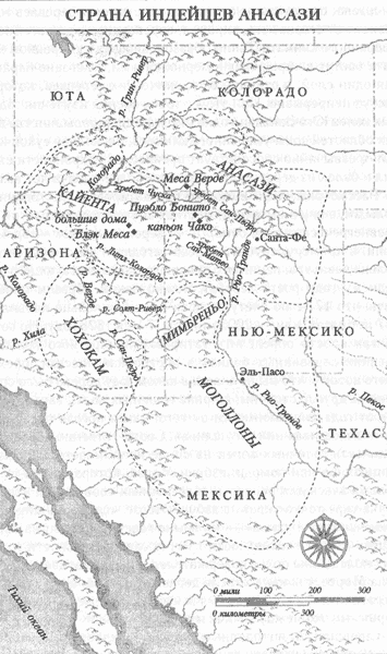 В тех примерах гибели цивилизаций, которые приведены в этой книге, географически самыми удаленными являются острова Питкэрн и Хендерсон — мы рассмотрели их в предыдущей главе. А ближайшими к Америке по местонахождению являются стоянки индейцев анасази в Национальном парке культуры Чако (илл. 9, 10) и в Национальном парке Meca Верде, находящиеся на американском Юго-Западе: на 57-й автостраде штата Нью-Мексико и возле государственной автострады 666, соответственно — менее чем в 600 милях от моего дома в Лос-Анджелесе. Подобно городам майя (их историю мы рассмотрим в следующей главе) эти и другие руины — остатки построенных первобытными американцами сооружений — сейчас являются популярными туристическими объектами, которые каждый год посещают тысячи человек. Среди коллекционеров произведений искусства высоко ценится наследие одной из этих древних культур американского Юго-Запада — мимбреньо: прекрасная керамика, украшенная геометрическими узорами и реалистическими фигурами — уникальные произведения, созданные народом, который едва насчитывал 4000 человек и достиг расцвета всего за несколько поколений до своего внезапного исчезновения. Конечно, нельзя не признать, что древние цивилизации Юго-Запада США с населением, исчисляемым скорее тысячами, чем миллионами, проигрывают в масштабе и внушительности городам майя. Города майя, большие по площади, более богаты памятниками архитектуры и произведениями искусства и были созданы более развитым, обладавшим письменностью классовым обществом. Однако именно анасази построили самые высокие каменные здания в Северной Америке, которые удерживали первенство вплоть до 1880-х годов, когда в Чикаго появились первые небоскребы из железобетона. Несмотря на отсутствие у анасази письменности, подобной той, что имелась у майя и позволила нам датировать дошедшие до нас документы с точностью до конкретного дня, чуть позже мы увидим, что и многие постройки Юго-Запада США могут быть датированы с достаточно высокой точностью — вплоть до года, позволяя таким образом археологам изучать историю этих цивилизаций с более точной привязкой ко времени, чем это возможно для островов Пасхи, Питкэрна и Хендерсона. На Юго-Западе США в свое время существовала и погибла далеко не единственная культура, таковых было несколько (см. карту 5). К числу древних цивилизаций Юго-Запада, которые пережили локальные катастрофы, радикальные преобразования жизненного уклада или исход из родных земель — в разных местах и в разное время, — принадлежат: мимбреньо, около 1300 года н. э.; население каньона Чако, Норд Блэк Меса и анасази на реке Вирджин — в середине или конце XII столетия; около 1300 года Meca Верде и анасази гор Кайента; моголлоны около 1400 года; и, возможно, самое позднее в XV столетии — племя хохокам, широко известное благодаря своей тщательно разработанной системе ирригации. Несмотря на то что жестокие потрясения, которые постигли перечисленные цивилизации, произошли еще до прибытия Колумба в Новый Свет, анасази не исчезли как народ: другие племена индейцев Юго-Запада, которые приняли в свои ряды потомков анасази, существуют по сей день — например, пуэбло (хопи и зуньи). Что же послужило причиной гибели или катастрофических изменений столь большого числа живущих по соседству народов? Велик соблазн объяснить подобные я