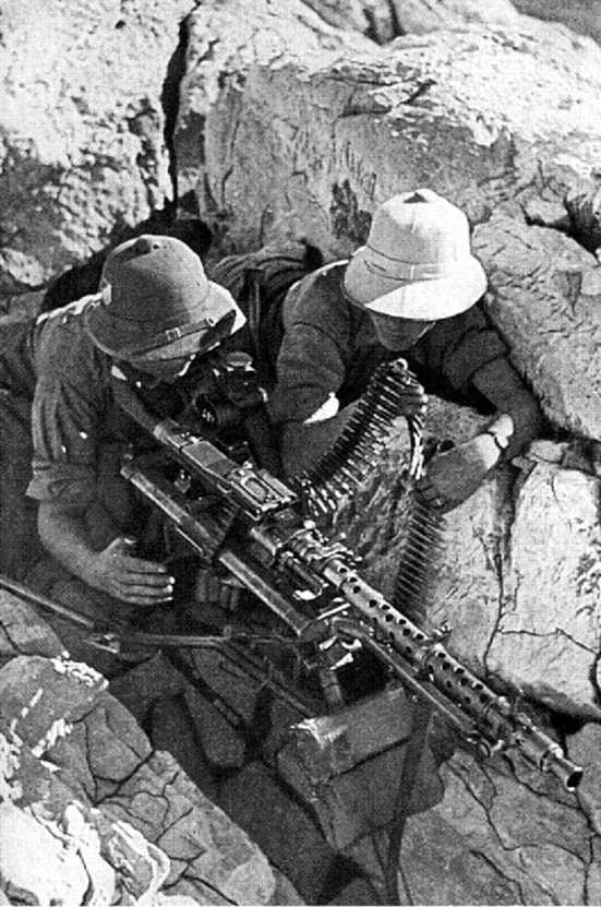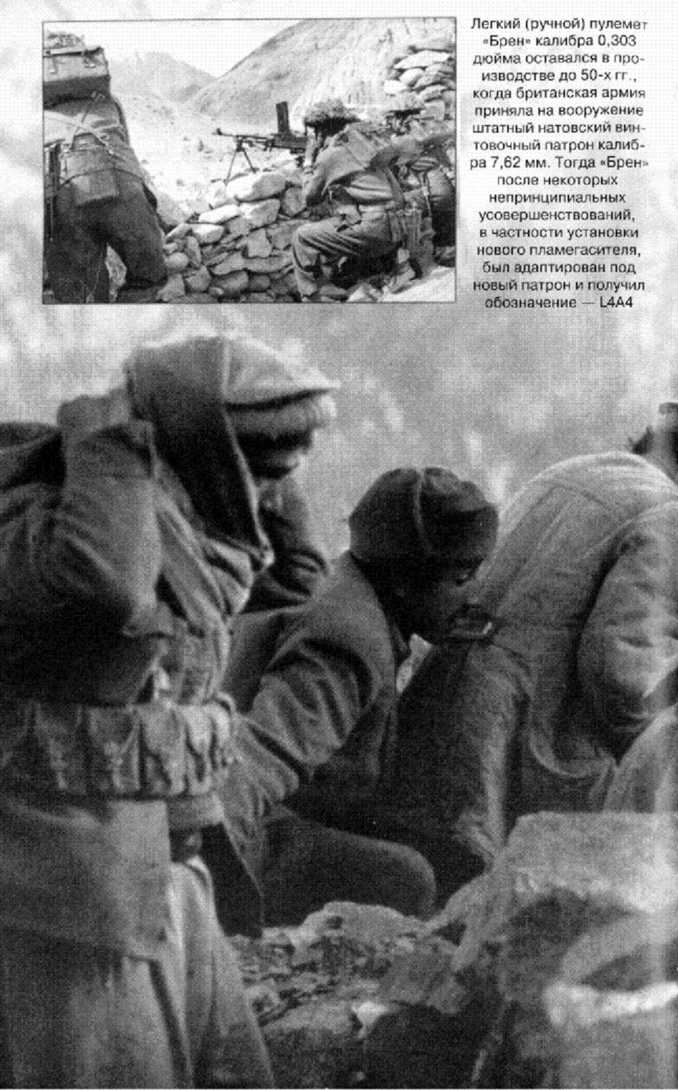 Иллюстрации Французская митральеза представляла собой одну из ранних попыток создать в XIX в. многозарядное оружие. Митральеза не была пулеметом в настоящем смысле, скорее залповым орудием, стрелявшим из всех своих 37 стволов единым выстрелом. С некоторым эффектом она использовалась во время Франко-прусской войны 1870–1871 гг. 1899 г. Американские морские пехотинцы ведут огонь из поздней модели «Гатлинга» на тихоокеанском острове Самоа. К этому времени «Гатлинг» с коленчатой рукояткой устарел вследствие появления полностью автоматического «Максима», который был принят на вооружение военно-морским флотом США в 1896 г.; в британской армии пулемет появился в 1891 г., а в германской — в 1895 г. Несмотря на то что орудие Гатлинга в очень малых количествах использовалось на заключительном этапе Гражданской войны в США, разрушительный потенциал этого многоствольного орудия так и не был раскрыт до конца 70-х годов XIX в., когда оно стало главным оружием имперской экспансии западных держав. · · · Пулемет «Брен», выпускаемый на Королевском заводе стрелкового оружия в Энфилде, впервые поступил на вооружение британской армии в 1938 г. Он представлял собой прямое усовершенствование чешского пулемета ZB vz26 и в течение всей Второй мировой войны показал себя одним из лучших среди всех легких пулеметов, когда-либо находившихся в долгом употреблении. Как и «Брен», британский пулемет «Беса» также появился в конце 30-х гг. XX в. и был разработан на основе оружия чешской конструкции (в этом случае ZB vz53). Поскольку пулемет «Беса» выпускался специально для использования на бронемашинах, было принято решение сохранить первоначальный калибр орудия — 7,92 мм, а не менять его на стандартный британский калибр 0,303 дюйма. Впервые принятый на вооружение в 1936 г., MG34 был первым в мире пулеметом общего назначения и первым легким пулеметом с ленточной подачей патронов. Это оружие, хотя и исключительно хорошо сконструированное, тем не менее в неблагоприятных условиях имело склонность к заклиниванию, и, так же как в его преемнике MG42, ствол, имевший воздушное охлаждение, нуждался в регулярных заменах, которые позволяли избежать перегрева. Немецкий пулемет MG42 принимает участие в боевых действиях в России в 1943 г. (именно в этом году его приняли на вооружение). Он представлял собой усовершенствованный вариант очень удачной конструкции MG34. Сконструированный как более скоростной и более технологичный пулемет, что делало его производство дешевым, MG42 тем не менее обладал отличными рабочими характеристиками своего предшественника, благодаря чему заслужил репутацию исключительно эффективного и надежного оружия. Впервые произведенный в 1942 г. для замены используемых в Красной армии «Максимов», СГ43 (станковый пулемет Горюнова) являлся пулеметом среднего типа. Это орудие, которое мы видим здесь на колесном станке конструкции Соколова, было принято на вооружение до 1945 г., но в действительности вытеснило «Максим» лишь после войны, став типовым советским средним пулеметом. Морские пехотинцы США на острове Иводзима в 1944 г. стреляют из трофейного японского пулемета системы Гочкиса. Японцы взяли «Гочкис» модели 1900 г. французского производства в качестве образца для своей собственной разработки и переконструировали его под штатный японский винтовочный патрон калибра 6,5 мм. Как и тяжелый пул