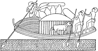 Глава XПЕРЕВОЗКИ И ТОРГОВЛЯ Во всех странах, занимающих одну лишь узкую долину большой реки, эта река становится естественным большим путем сообщения для всех случаев, особенно если, как в Египте, по стране трудно перемещаться в течение значительной части года. Обычными дорогами египтян были Нил и каналы; все виды грузов перевозили на лодках и судах, все поездки осуществлялись по воде, и даже изображения богов проезжали в торжественной процессии по Нилу на ладьях – а как еще мог путешествовать бог, если не в ладье? Это было настолько само собой разумеющимся, что в языке египтян трудно найти слово, означающее путешествовать: они пользовались словами хонт – подниматься вверх и ход — спускаться вниз по течению. Первое из этих слов применялось, когда говорили о любом путешествии на юг, второе – о любом путешествии на север, даже когда речь могла идти о пути через пустыню[302]. В таких обстоятельствах естественно, что постройка речных судов рано стала у этого народа особым искусством. ![]() Египетский орнамент на потолке Самая древняя разновидность лодки, которая была в ходу у египтян, – это, несомненно, маленькие ладьи из папируса – такие же, как те, которыми в более поздние времена восхищались греки, и похожие на те, которыми и теперь пользуются в Судане. Эти лодки не имели палубы, это были, по сути дела, маленькие плоты, сделанные из связанных вместе пучков стеблей папируса. В середине они были несколько шире, чем на концах, задняя часть была обычно приподнята, а передняя лежала плашмя на поверхности воды. Меньшие по размеру из этих лодок, с трудом вмещавшие двух человек, были равны по длине всего одной связке папируса; более крупные (некоторые были даже такого размера, что могли везти быка) состояли по длине из нескольких умело скрепленных между собой связок. При постройке этих лодок[303] прилагались все возможные старания, чтобы прочно связать стебли папируса. Для этого вокруг них закрепляли скрученный втрое канат на расстоянии примерно девять дюймов между витками. Если такая лодка была предназначена для господина, на ее пол стелили толстую циновку для защиты от влаги. Эти папирусные ладьи имели очень небольшую осадку и поэтому очень широко использовались пастухами, охотниками и рыбаками на мелководье в болотах. Ими было легко управлять по причине их легкого веса и малого размера, и даже там, где вода была слишком мелкой, их можно было без труда донести (или провести) до более глубокого места. Маленькие папирусные челны никогда не имели парусов, и на них не гребли по-настоящему: они передвигались с помощью либо шестов, имевших два острых конца, чтобы цепляться за дно, либо коротких весел с широкими лопастями, которыми египтянин легко греб, лишь слегка их погружая в воду. Второй способ можно было одинаково хорошо применять стоя или сидя. Этот примитивный способ гребли, которым и сейчас пользуются некоторые из наших речных рыбаков, очень хорошо подходит для маленьких папирусных лодок, в особенности если они везут легкий груз; легкого гребка достаточно, чтобы заставить такие лодки скользить по гладкой поверхности воды. Иногда египтяне строили папирусные суда более крупного размера[304] – так, например, во времена правления VI династии мы обнаруживаем одно такое судно, для которого были нужны самое меньше тридцать два гребца и рулевой. Это н