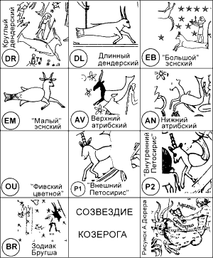 Глава 4. Символика египетских зодиаков. Новая, более полная расшифровка4.1. Символы созвездийВ целом, фигуры созвездий на египетских зодиаках очень похожи на рисунки тех же созвездий в старинных европейских сочинениях по астрономии. Все двенадцать зодиакальных созвездий в «древне»-египетском исполнении обычно распознаются без особого труда и расшифровывать их, к счастью, не требуется. Тем не менее, как мы обнаружили, на египетских зодиаках есть некоторые важные особенности фигур созвездий, не встречающиеся на европейских рисунках. Эти особенности, по-видимому, не были замечены ранее. Между тем, они важны для расшифровки зодиаков в целом. Речь идет о том, что фигуры созвездий на египетских зодиаках иногда объединялись с символами планет, образуя тем самым более сложный символ – так сказать, «астрономический иероглиф». Подробнее о таких «астрономических иероглифах» на египетских зодиаках пойдет речь ниже, в разделе о символике частных гороскопов. В этом разделе мы остановимся пока лишь на египетских символах созвездий как таковых. Итак, пройдемся по всем зодиакальным созвездиям и перечислим их изображения на египетских зодиаках. 4.1.1. Созвездие овна рис.4.1 Начнем с созвездия Овна. На рис.4.1 приведены рисунки этого созвездия на различных египетских зодиаках. Для сравнения показана также фигура Овна с европейской звездной карты А.Дюрера, рис.4.2. Считается, что Дюрер нарисовал эту карту в 1515 году [29], с.8. Так это или нет, для нас сейчас неважно. Важно лишь, что это – позднесредневековый астрономический рисунок, выполненный в Западной Европе в эпоху XVI-XVIII веков. рис.4.2 На рис.4.1 очень хорошо видно, что все «древне»-египетские изображения Овна выполнены совершенно в том же духе, что и рисунок А.Дюрера. Хотя по скалигеровской хронологии их якобы разделяет огромный промежуток времени – полторы тысячи лет. Однако этот чудовищный временной разрыв почему-то нисколько не помешал «древним» египтянам рисовать созвездие Овна совершенно так же, как это делали и в средневековой Европе. Дело тут в неправильной хронологии Скалигера. Как только мы исправляем хронологию, все становится на свои места. Очевидно, египетские зодиаки создавались не в глубокой древности, как уверяет нас скалигеровская версия истории, а в средние века. Напомним, что согласно нашей реконструкции [РЕК] развитие астрономии в Египте и в Европе было одновременным и происходило в обстановке постоянного взаимодействия между различными частями Великой=Монгольской Империи. В частности – между Европой и Египтом. И лишь после распада Великой Империи связь Египта и Европы надолго прервалась. Изоляция Египта от Европы продолжалась около 200 лет и была нарушена лишь с приходом туда войск Наполеона на рубеже XVIII и XIX веков. Вернемся к рисункам созвездий. Выше мы убедились, что созвездие Овна на египетских зодиаках выглядит точно так же, как и на европейских средневековых рисунках. Оказывается, это верно и для большинства других зодиакальных созвездий. Продолжим наше движение по эклиптике, перебирая одно за другим все 12 созвездий Зодиака и сравнивая их «древне»-египетские изображения с рисунками средневековых европейцев. 4.1.2. Созвездие ТельцаЗа Овном на эклиптике располагается созвездие Тельца. На рис.4.3 приведены изображения Тельца на египетских зодиаках и на средневековой звезд