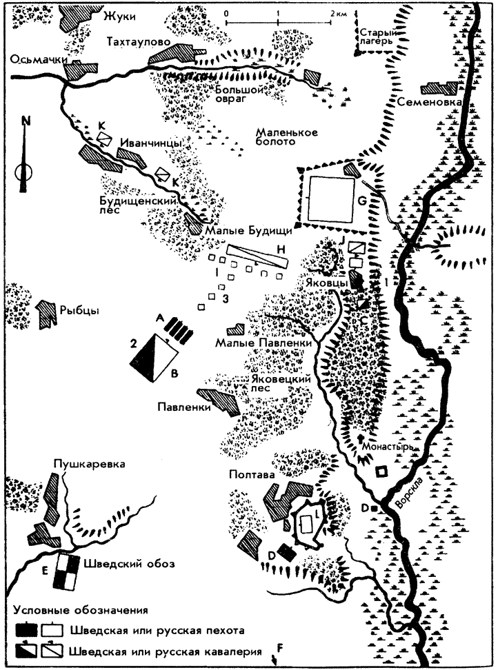 КАРТЫ 1. Карта Швеции 2. Шведское вторжение в Россию 1708–1709 гг ПОДГОТОВКА К СРАЖЕНИЮ 1. Шведская основная армия переправляется через Вислу в декабре 1707 года, движется на восток через Мазурию, где вспыхивает короткая, но ожесточенная партизанская война. 2. 28 января 1708 г. шведы занимают Гродно. Русские опустошают страну и отступают на восток. Шведское войско преследует их. 3. Преследование прерывается в начале февраля под Сморгонью. Шведы уходят на зимние квартиры. 4. В начале июня шведская основная армия идет дальше. Обходит многочисленные русские заградительные позиции и 4-го июляодерживает победу над русскими под Головчином. 5. Левенхаупт отправляется в путь в конце июня, чтобы вместе со своим корпусом присоединиться к основной армии. 6. Шведская основная армия останавливается у Могилева, ждет Левенхаупта, но в августе вынуждена идти дальше. Шведы тщетно пытаются навязать русским открытый бой, те лишь продолжают отступать. 7. В начале сентября основная армия останавливается. Прежде всего по причинам, связанным с продовольственным снабжением, она вынуждена повернуть на юг. 8. Тем временем корпус Левенхаупта медленно двигался на юг. 29 октября он был атакован русскими под Лесной. Остатки корпуса в октябре присоединяются к основной армии. 9. В начале ноября шведская основная армия переправляется через Десну. Мятежные казаки поддерживают шведов. 10. Основная армия становится на зимние квартиры. Зима переносится все тяжелее. Происходит несколько мелких стычек. 11. В конце января 1709 года шведы возобновляют наступление, но плохая погода быстро кладет ему конец 12. Шведская армия сосредоточивается между реками Псёл и Ворскла. Начинается примерно четырехмесячный оборонительный период. Пытаясь выиграть время, 1 мая шведы приступают к осаде города Полтава. 3. Исходное положение ШВЕДСКИЕ СИЛЫ (А-F) А. 8200 солдат пехоты (18 батальонов), 4 артиллерийских орудия В. 7800 солдат кавалерии (109 эскадронов) С. Валашский полк: 1000 всадников нерегулярной кавалерии (12 эскадронов) D. Войска в осадных укреплениях: 1100 солдат пехоты (2,5 батальона), 200 солдат кавалерии (4 эскадрона), 2 артиллерийских орудия. Е. Обоз: 200 солдат кавалерии (25 эскадронов), небольшое количество отдельных пехотинцев, неизвестное количество казаков и запорожцев, 28 артиллерийских орудий. F. Разные отряды за пределами карты в низовьях Ворсклы: 1800 всадников кавалерии (16 эскадронов). РУССКИЕ СИЛЫ (G-L) G. 25000 солдат пехоты (51 батальон), 73 артиллерийских орудия. Н. 9000 солдат кавалерии (85 эскадронов), 13 артиллерийских орудий. I. Линия укреплений: 4000 солдат пехоты (8 батальонов), 16 артиллерийских орудий. J. Дозор у деревни Яковцы: 1000 солдат пехоты (2 батальона), 1000 солдат кавалерии (8 эскадронов). К. Неизвестное количество казаков. L. Гарнизон Полтавы: 4000 солдат пехоты, 28 артиллерийских орудий. ВСТУПИТЕЛЬНЫЕ ОПЕРАЦИИ (1–3) 1. Шведский Валашский полк производит отвлекающую атаку на Яковцы. 2. Шведские главные силы совершают марш. Кавалерия заблудилась, и потому опаздывает. 3. Шведы обнаружены. Русские поднимают тревогу; русская кавалерия строится для боя. 4. Прорыв пехоты 1. Далекарлийцы и вестерботтенцы под командованием Рооса штурмуют первый редут. Затем Далекарлийцы берут второй. 2. Батальоны Левенхаупта с правого края расширяют занятое ими пространство. Среди пехоты происходит общее движение направо. 3. Ряд батальонов — в ко