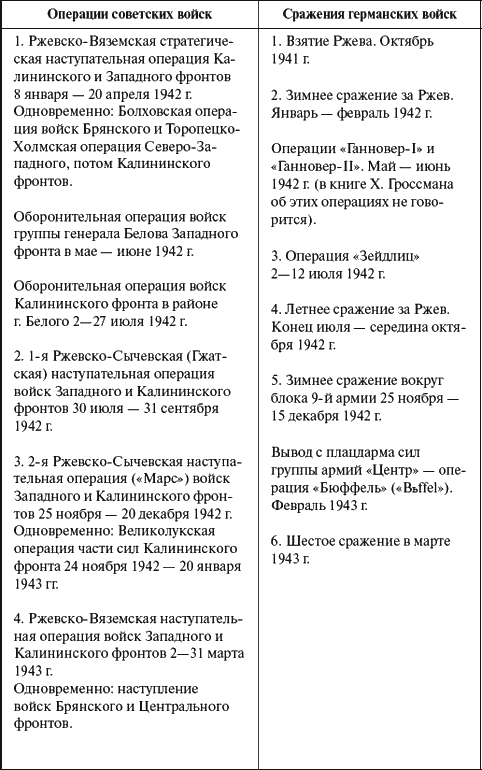 Часть третьяИтоги битвы «Это большая и длительная битва»После описания военных действий в районе ржевско-вяземского выступа в январе 1942 – марте 1943 гг. вполне естественно, опираясь на существующий понятийный аппарат, дать им оценку, определить их масштаб, установить, что же это было – бои или битва. Приведенные в начале книги определения боя и битвы и знакомство с действиями фронтов и армий на московском направлении в течение трех кампаний первого и второго периодов Великой Отечественной войны не позволяют назвать эти действия простыми боями, то есть действиями тактического масштаба. Даже простое хронологическое описание хода военных действий в районе ржевско-вяземского выступа позволяет увидеть, что они выходят далеко за рамки боев и сражений, как это утверждала и утверждает официальная отечественная историография. Не отражает масштаба действий и история отдельных, не связанных между собой, наступательных операций советских войск. Факты свидетельствуют, что на протяжении зимней 1941/42 гг., летне-осенней 1942 г. и зимней 1942/43 гг. военных кампаний на московском направлении разворачивалась битва крупных группировок войск обеих воюющих сторон для достижения стратегических целей. В этой битве одна сторона – советская – пыталась нанести поражение группировке противника, стоящей у стен столицы советского государства, на западном стратегическом направлении. Другая сторона – германская – пыталась удержать стратегически выгодный плацдарм в центре Восточного фронта. Исходя из определений, приведенных в начале книги, такие действия следует определить как военные действия стратегического масштаба, и они просто классически укладываются в понятие битвы. В течение длительного времени – 15 месяцев – на одном из участков западного стратегического направления – московского – советскими войсками одна за другой были проведены четыре крупные наступательные операции, объединенные единым замыслом. Составной частью этих операций были фронтовые и армейские операции. Отдельные операции этих фронтов были поддержаны одновременными наступательными операциями соседних фронтов и армий. Здесь также было осуществлено несколько оборонительных фронтовых операций оперативного масштаба. Все эти операции объединены территориально, конфигурацией фронта: проводились они в районе ржевско-вяземского выступа. Этим операциям советских войск противостояли оборонительные и наступательные операции войск вермахта. В данной работе они перечислены в интерпретации генерала Х. Гроссмана в книге «Ржев – краеугольный камень Восточного фронта». Книга вышла в Германии в 1962 г., переведена на русский язык и издана в Ржеве в 1996 г. В ответе одному тверскому краеведу из германского военного архива в г. Фрайбурге говорится, что книга бывшего командира 6-й пехотной дивизии, воевавшей на выступе, отражает взгляд на события немецкой стороны. В книге говорится о нескольких последовательных сражениях, или битвах, в районе ржевского выступа, хотя в немецком языке сражение и битва называются одним словом «Schlacht». Несмотря на некоторые расхождения, советские операции и немецкие сражения в 1942–1943 гг. по датам, в принципе, совпадают. Следует уточнить, что с генералом согласиться можно далеко не во всем. Например, подавление сопротивления отдельных отступающих част
