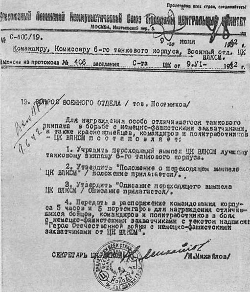 Иллюстрации Боевой путь 11-го гвардейского Прикарпатско-Берлинского Краснознаменного ордена Суворова танкового корпуса Положение войск Калининского и Западного фронтов к 15 июля 1942 г. Оборонительные бои 6-го танкового корпуса на Курской дуге 6–12 июля 1943 г. Направление контратак 10-го и 5-го гвардейского танковых корпусов 12 июля 1943 г. Выход передовых отрядов 6-го танкового корпуса на железную дорогу Харьков — Полтава в районе Высокополья и бои с подошедшими резервами противника 9–17 августа 1943 г. Боевые действия 11-го гвардейского танкового корпуса в Житомирско-Бердичевской операции 28 декабря 1943 г. — 16 января 1944 г. Боевые действия 11-го гвардейского танкового корпуса 23–31 марта 1944 г. Боевые действия 11-го гвардейского танкового корпуса за переправу через р. Сан и город-крепость Перемышль 22–27 июля 1944 г. АНДРЕЙ ЛАВРЕНТЬЕВИЧ ГЕТМАН Командир 112-й танковой дивизии полковник А. Л. ГЕТМАН Командование 6-го танкового корпуса (справа налево): командир корпуса генерал-майор танковых войск А. Л. Гетман, начальник штаба полковник Н. С. Комаров и комиссар корпуса бригадный комиссар П. Г. Гришин Переходящее Красное знамя МК и МГК ВЛКСМ, врученное 6-му танковому корпусу Текст решения ЦК ВЛКСМ от 9 июня 1942 г. об учреждении переходящего вымпела ЦК ВЛКСМ лучшему танковому экипажу 6-го танкового корпуса Разведчица 100-й танковой бригады Женя Данилюк Командир 112-й Краснознаменной танковой бригады М. Т. Леонов (справа) и начальник политотдела бригады С. Б. Вобян (1943 г.) Маршал Чойбалсан, глава делегации Монгольской Народной Республики, прибывшей на фронт, вручает подарки воинам 112-й Краснознаменной танковой бригады «Революционная Монголия» (январь 1943 г.) Маршал Чойбалсан выступает на митинге танкистов 112-й Краснознаменной танковой бригады Танковая колонна «Революционная Монголия» на марше (1943 г.) Слева направо: Герой Советского Союза майор Ф. П. Боридько, командир бригады полковник М. Т. Леонов, командир батальона Герой Советского Союза майор П. И. Орехов (июнь 1943 г.) Командир 6-го танкового корпуса А. Л. Гетман среди личного состава соединения (апрель 1943 г.) Командир 200-й танковой бригады Н. В. Моргунов вручает переходящий вымпел ЦК ВЛКСМ лучшему танковому экипажу лейтенанта Тихановского Группа офицеров во время занятий в районе г. Обояни; справа командир бригады полковник М. Т. Леонов, слева начальник штаба подполковник И. И. Гусаковский Мотострелки 112-й танковой бригады ведут бой на Курской дуге И. И. РЫБАЛКО Полковник М. Т. Леонов (слева) и подполковник И. И. Гусаковский во время контрнаступления на Курской дуге И. К. ДРЫГАЙЛО Герой Советского Союза М. К. ЗАМУЛА П. Г. СПИРИН Вручение гвардейского знамени одной из частей 11-го гвардейского танкового корпуса А. Л. Гетман (справа) среди офицеров 44-й гвардейской танковой бригады 44-я гвардейская Краснознаменная танковая бригада в исходном положении перед вводом в прорыв 24 декабря 1943 г. На переднем плане командный состав бригады Вперед, на Бердичев! (декабрь 1943 г.) Герой Советского Союза П. И. ОРЕХОВ Герой Советского Союза Г. С. ПЕТРОВСКИЙ Н. Г. ВЕДЕНИЧЕВ Герой Советского Союза Ю. С. СОКОЛОВ Герой Советского Союза В. М. ГИНТОВТ Герой Советского Союза И. К. ЗАХАРОВ Герой Советского Союза И. П. ЯРКИН Герой Советского Союза В. Н. МАКСАКОВ Начальник политотдела бригады подполковник В. Т. Помазнев (слева) подписывает партийные документы пер
