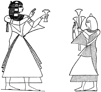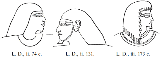 Глава IIIПока мы смотрели на древности Египта как на что-то неизвестное и ограничивались тем, что любовались ими как чудесными диковинами, впечатление странности, возникавшее от всего в целом, заставляло нас не обращать внимания на многочисленные различия между отдельными памятниками. Даже когда мы постепенно научились делить историю Египта на длинные эпохи, прошло еще немало времени, прежде чем наше зрение стало настолько острым, что мы смогли рассмотреть эти несколько эпох. Долгое время люди говорили о египетском искусстве, египетской религии и египетском языке так, словно они не претерпели очень больших изменений за три тысячи лет, и настроили свои умы на то, что египтяне по характеру были необыкновенно консервативны. Теперь мы знаем, что эти выводы не подтверждаются. В течение трех тысяч лет своей древней истории язык, верования и искусство древних египтян менялись не больше и не меньше, чем у любого другого народа в тех же условиях, и лишь из-за недостатка знаний мы так долго недооценивали эти различия. ![]() Голова Нефергора, хранителя архивов складов зерна, рядом с ним сидит его жена (Берлинский музей, 2303) Это утверждение верно и для одежды, которая у цивилизованных народов, возможно, переносит больше всего изменений. В эпоху Древнего царства египтяне носили короткую юбку вокруг бедер, во времена Среднего царства была добавлена вторая юбка, а во времена Нового царства была закрыта и грудь. Приглядевшись внимательней, мы обнаружим и много других изменений – тех, которые происходили в пределах этих больших эпох. Если в одном веке юбка была короткой и узкой, то в следующем она становилась широкой и бесформенной, а век спустя в моде была только юбка, определенным образом уложенная в складки. Различные слои общества тоже отличались один от другого одеждой: наряд царя отличался от одежды его придворных, а чиновники в домашнем хозяйстве знатнейших князей одевались иначе, чем слуги, пастухи или лодочники. Разумеется, в этом случае мода тоже диктовала свою волю: одежду высших слоев общества быстро перенимали слои, которые находились непосредственно ниже их, тогда эта одежда переставала быть модной, знатные господа оставляли ее народу и начинали носить другую. Например, сразу после ухода с исторической сцены V династии знатнейшие князья царства стали подражать в одежде прежним царям, а позже этот наряд стал официальной одеждой старших ремесленников; тот самый наряд, в котором придворные царя Снофру появлялись во дворце, через не слишком большой промежуток времени уже носили старшие служители в домашних хозяйствах знати. ![]() Простейшая форма юбки (по L. D., ii. 4) ![]() Юбка, удлиненная ниже колен. IV династия (по L. D., ii. 9) Мы должны прибавить к этому еще несколько различий: одежда старых людей была длиннее и теплее, чем у молодых, в присутствии царя, люди были одеты более модно, чем дома или на охоте. Запас данных по этой теме неистощим, и они заслуживают более внимательного рассмотрения, чем то, которое возможно в тесных пределах этой книги. Я должен ограничиться показом основных разновидностей различных типов одежд[74]. Однако я надеюсь, читатель почувствует, что в одежде, несмотря на простоту составных частей, сравнительно часто происходили изменения. Самым древним нарядом людей высокого звания, кажется, была простая короткая юбка, которая