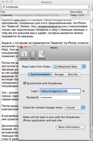 Софт: Simplenote - заметки на iPhone и на десктопе Автор: Михаил Карпов Опубликовано 30 июня 2010 года Когда возникает необходимость по-быстрому записать какую-либо информацию, современный человек обычно достаёт из кармана смартфон и запускает приложение, специально для этого предназначенное. На iPhone - это "Заметки" (Notes). Увы, это приложение синхронизируется с компьютером только при подключении с помощью провода, к тому же его внешний вид и шрифт, которым делаются записи, понравятся не каждому. Задачи, с которыми не справляются "Заметки" на iPhone, отлично выполняет приложение SimpleNote (также доступна версия для iPad). Оно синхронизирует записи со своим сервером, на котором пользователю предлагается завести аккаунт, а также позволяет отправлять их по электронной почте. Потом эти записи можно просмотреть как в веб-интерфейсе, доступном на сайте разработчика, так и в в одной из двух программ для Mac OS X: Notational Velocity или JustNotes. Какую из них выбрать - решать уже пользователю, так как особых различий по возможностям у них нет. Вот основное окно SimpleNote. Можно воспользоваться строкой поиска, перейти к нужной записке, добавить новую (знак "+" справа вверху) или покопаться в настройках. После входа в запись, её можно отредактировать, отправить по электронной почте, или удалить. В настройках можно создать новую учётную запись или войти в уже существующую, а также настроить вид программы. Дополнительные возможности доступны для платных аккаунтов. Их пользователи могут выключить рекламу, включить автоматическое резервное копирование, создавать записи с помощью почтовых сообщений, а также многое другое. Подписка стоит 9 долларов. Десктопное приложение Notational Velocity. Простой интерфейс и возможности шифрования локального контента. Приложение JustNote для Mac OS X всё ещё находится в стадии бета-тестирования, но уже может похвастаться новомодным "тёмным" интерфейсом. |