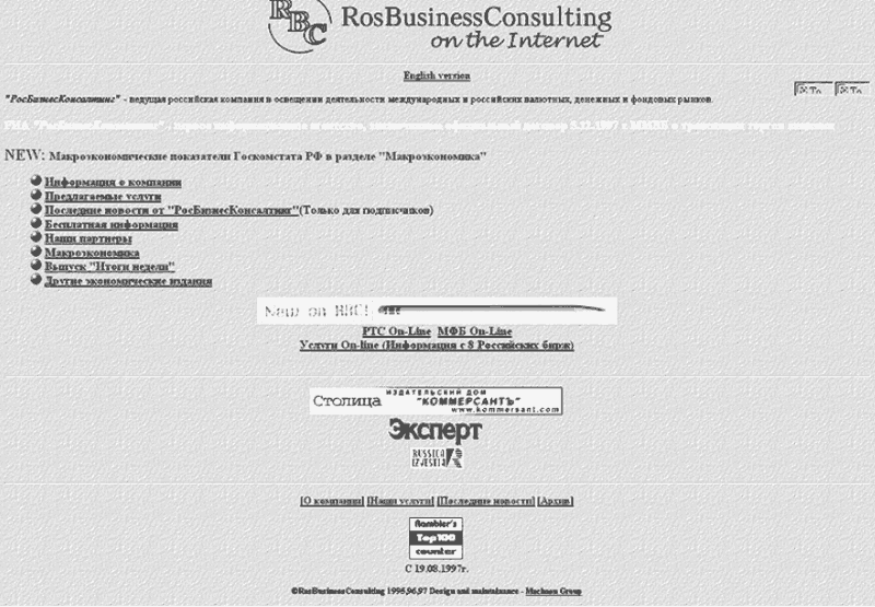 Для того чтобы увидеть возможности архива Интернета, приведем хранящиеся там изображения сайтов РосБизнесКонсалтинга (www. rbc.ru) от 10.12.1997 г. и Мост-банка (www.most.ru) от 16.01.1997 г. (рис. 2, 3). Позже мы расскажем более подробно о том, как пользоваться этим сервисом. 2. Информация перепечатывается другим пользователем. Любой человек, компания или новостное агентство может перепечатать у себя слова пользователя со ссылкой на источник и прокомментировать их. Слова пользователя интернет-форума могут быть процитированы другим участником того же форума и за счет этого выйдут из-под контроля автора. Автор может попросить их убрать того, кто цитировал, либо модератора форума, однако не в его силах заставить кого-либо выполнить эту просьбу. ![]() Рис. 2. Сайт РосБизнесКонсалтинг от 10.12.97 г. в архиве Интернета. ![]() Рис. 3. Сайт Мост-банка от 16.01.1997 г. в архиве Интернета 3. Сообщение пользователя попадает в так называемые топы различных ресурсов и остается там. Это явление характерно главным образом для блогов. Как только какая-либо тема начинает обсуждаться достаточно активно, она фиксируется специальными сайтами и ее копия размещается там в разделах вроде TOP-30 Живого Журнала за такое-то число. Нередко с этих сайтов новость попадает в тематические рассылки и распространяется всем подписчикам в разных городах и даже странах. Многие ресурсы в Интернете стали интерактивными. Действительно, еще десять лет назад рядовой человек или небогатое предприятие не могли получить возможность высказать свою точку зрения на те или иные события или проблемы. Сегодня в Интернете появляются примеры, показывающие, что любой человек может сделать это так «громко», что будет услышан во всем мире и при необходимости получит помощь. Люди, еще вчера не знакомые друг с другом, в одно мгновение объединяются общей идеей или отношением к какой-то проблеме и начинают выступать сообща. Если тема интересна, пользователи могут самостоятельно присоединиться к ее обсуждению или даже принять участие в ее решении оф-лайн. Потенциал влияния интерактивного Интернета на реальную жизнь отчетливо просматривается на примере таких безобидных ресурсов, как сообщество «Даром» в Живом Журнале (ЖЖ, или Livejournal), www.community.livejournal.com/darom/ и сообщество Живого Журнала «Флэшмоб» (www.community.livejournal.com/fmob/). Вот описание сообщества «Даром», приведенное в его Журнале: