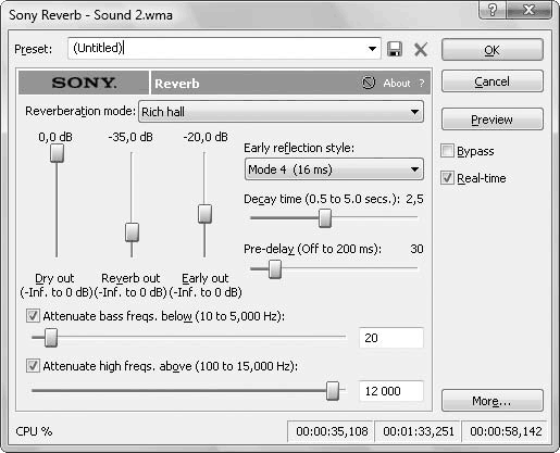 Глава 6Применение эффектов Введение в эффекты Настройка эффектов Применение эффектов позволит придать звуковым композициям оригинальное звучание, сделать их объемными и расставить звуковые акценты. Для решения этой задачи в программе Sound Forge 9.0 содержится обширный набор инструментов и эффектов, которые можно применить к звуковому фрагменту или всей композиции. Введение в эффектыВ программе доступно более 40 специальных эффектов и преобразователей звука. Все эффекты можно разделить на группы. • Эффекты эха – создают эффекты, добавляющие эхо. • Эффекты высоты тона – создают эффекты звучания, основанные на изменении высоты тона. • Эффекты громкости – создают эффекты на основе громкости, применяя амплитудную модуляцию, искажение, сжатие и др. • Эффекты реверберации – эффекты, основанные на времени, дают ощущение пространства, позволяя имитировать звучание в концертном зале или закрытом помещении. В меню Effects (Эффекты) (рис. 6.1) содержатся параметры, позволяющие достичь следующих эффектов: ![]() Рис. 6.1. Параметры меню Effects (Эффекты) • Accoustic Mirror (Аккустическое зеркало); • Amplitude Modulation (Амплитудная модуляция); • Chorus (Хорус); • Delay/Echo (Задержка/Эхо) – содержит подменю с пунктами Simple (Простое) и Multi-Tap (Многоотводное); • Distortion (Искажение); • Dynamics (Динамика) – содержит подменю с двумя пунктами Graphics (Графическая) и Multi-Band (Многополосная); • Envelope (Огибающая); • Flange /Wah-wah (Фленжер/Вау-вау); • Gapper/Snipper (Прореживатель/Резатель); • Noise Gate (Шумовой клапан); • Pitch (Высота) – содержит подменю с пунктами Bend (Отклонение) и Shift (Сдвиг); • Reverb (Реверберация); • Vibrato (Вибрато); • Wave Hammer (Волновой молот). Подробнее о данных эффектах будет рассказано ниже. Прежде чем говорить о настройках каждого эффекта в отдельности, сформулируем общую последовательность действий при применении эффекта к аудиоданным. Общий алгоритм применения эффекта к звукам в программе Soumd Forge можно описать следующим образом. 1. Выделите звуковой файл, выполнив команду Edit > Select All (Правка > Выделить все) – будет выделен весь файл. Если необходимо выделить фрагмент файла, то используйте команду Edit > Selection > Set (Правка > Выделение > Установить) и в открывшемся окне Set Selection (Установить выделение) укажите временные границы выделения (как это сделать, рассказывалось в предыдущих главах книги). 2. Войдите в меню Effects (Эффекты) и выберите в нем эффект, который нужно применить. 3. Настройте параметры эффекта по своему усмотрению или используйте заранее заданные установки из раскрывающегося списка Preset (Предустановка). 4. Прослушайте сделанные изменения, нажав кнопку Preview (Просмотр), и примените эффект. Как видите, алгоритм такой же, как и с применением процессоров. Рассмотрим более подробно настройку некоторых эффектов. Настройка эффектовОсновной момент в применении эффектов к звуковым фрагментам и композициям заключается в настройке эффекта определенным образом. Все настройки выполняются в специальных окнах, так же, как и при настройке процессоров. Для каждого эффекта применяется свое окно с соответствующими элементами управления и настраиваемыми параметрами. Эффект Simple Delay (Простая задержка)Эффект Simple Delay (Простая задержка) позволяет применять базовые эффекты эха к звуковым фрагментам и композициям. Чтобы использовать этот эффект, нужно выполнить следующие действия. 1. Выделить фрагмент аудиоданных, к которым 