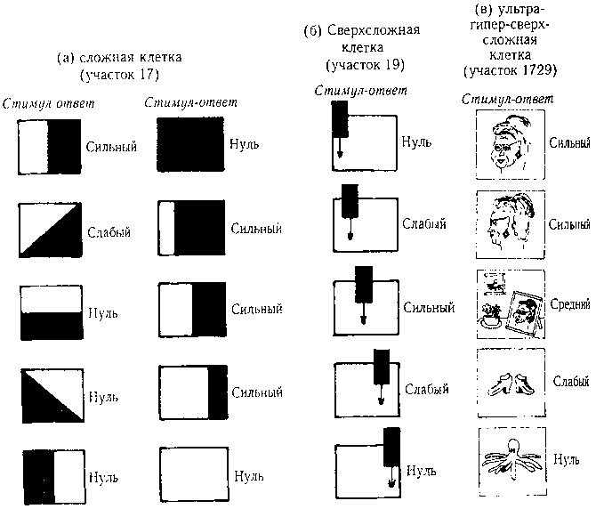 Интересно, что в конце 1940-х годов, примерно в то же время, когда Лашли проводил свои эксперименты, в Канаде было найдено подтверждение противоположной точки зрения. Нейрохирург Вильдер Пенфильд изучал реакции пациентов во время операции над мозгом, вводя в различные области открытого мозга электроды и посылая слабые электрические импульсы, стимулирующие нейрон или нейроны, которых касался данный электрод. Эти импульсы были подобны импульсам, исходящим от других нейронов. Пенфильд обнаружил, что стимуляция определенных нейронов регулярно вызывает у пациентов специфические образы или чувства. Искусственно вызванные таким образом впечатления были самые разнообразные иногда пациенты испытывали странный, необъяснимый страх, иногда они видели цвета и слышали звуки — но самыми впечатляющими были случаи когда пациенты вспоминали целую цепь событий из далекого прошлого, как, например, детский праздник дня рождения. Набор точек способных вызвать подобную реакцию, был весьма мал: практически речь шла об одном-единственном нейроне. Очевидно что результаты, полученные Пенфильдом разительно отличаются от заключения Лашли, поскольку из них вытекает, что специфические воспоминания хранятся в строго определенных зонах мозга. Какой вывод можно из этого сделать? Возможным объяснением было бы то, что одно и то же воспоминание закодировано одновременно в нескольких местах, расположенных по всей коре — стратегия, которая могла развиться в процессе эволюции, как защита от возможной потери части коры в бою — или во время экспериментов, проводимых нейрофизиологами. Другое возможное объяснение — то, что воспоминания могут восстанавливаться на основе динамических процессов, распространенных по всему мозгу, но при этом могут вызываться возбуждением местных точек. Эта теория основана на современных телефонных сетях, где распределение междугородных звонков не известно заранее, а выбирается в момент данного звонка в зависимости от загруженности телефонных сетей по всей стране. Поломка части сетей не остановит звонки — они будут просто направлены в обход испорченного места. В этом смысле любой звонок потенциально невозможно локализовать. И в то же время любой звонок соединяет всего две точки; в этом смысле локализовать его вполне возможно. Определенность в обработке зрительных образовОдно из самых интересных исследований по локализации мозговых процессов проводилось в последние пятнадцать лет Дэвидом Хюбелем и Торстеном Визелем из Харвардского университета. Они проследили путь зрительных впечатлений в мозгу у кошки: сначала возбуждаются нейроны на сетчатке, возбуждение распространяется по направлению к затылку, проходит через боковое коленчатое тело, работающее в качестве «ретрансляционной станции», и прибывает к зрительной коре в задней половине мозга. Прежде всего, в свете результатов Лашли кажется удивительным, что существуют определенные мозговые пути; но еще более замечательными оказались свойства нейронов, расположенных на различных участках этого пути. Оказывается, что нейроны сетчатки прежде всего воспринимают контраст. Это происходит следующим образом, обычно каждый из этих нейронов возбуждается с постоянной скоростью. Когда на него падает свет, нейрон может начать возбуждаться быстрее, замедлиться, или сов