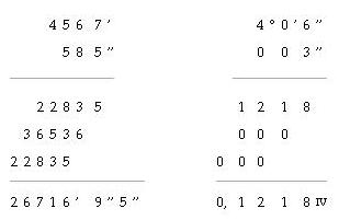 Десятичныя дроби. Первые намеки на десятичныя дроби можно просл?дить у творцовъ ари?метики,—индусовъ. Они пользовались ими при извлеченіи квадратныхъ корней, въ т?хъ случаяхъ, когда корень не извлекается точно; тогда они прписывали столько паръ нулей, сколько желательно им?ть лишнихъ знаковъ въ корн?. Индусы писали десятичныя дроби со знаменателями, и имъ не удалось распространить общей десятичной нумераціи также и на дроби. Заслуга въ этомъ отношеніи принадлежитъ арабамъ, и въ частности т?мъ арабамъ, которые жили въ Испаніи. Между 1130 и 1150 г. по Р. X. появилось въ Толедо сочиненіе «Практическая ари?метика алгоризма», принадлежащее Іоанну Севильскому. У него уже зам?тны явственные сл?ды десятичныхъ дробей, и при томъ съ такимъ характеромъ, какой он? носятъ у насъ. Посл? Іоанна Севильскаго десятичныя дроби какъ-то стушевываются, т?мъ бол?е, что т? времена были не особенно благопріятны вообще для западно-европейской науки. Но идея не пропала, и ее мы видимъ возрожденной у Кардана (XVI ст.). Между прочимъ, он? стали прим?няться въ тригонометріи для вычисленія синусовъ. Кр-м? того, стали ими пользоваться при д?леніи съ остаткомъ, чтобы выразить отв?тъ точн?е и дать въ частномъ не только ц?лыя числа, но и рядъ долей съ десятичными знаменателяии. Грамматеусъ въ 1523 году сов?туетъ прим?нять десятичныя дроби къ такому случаю. Пусть требуется сравнить ? съ ? и узнать, которая величина больше. Тогда мы къ каждому числителю приписываемъ по нулю, иначе сказать—раздробляемъ въ десятыя доли, и д?лимъ на знаменателя, получимъ 62? и 66?, сл?д., вторая величина бол?е первой. Честь полнаго введенія десятичныхъ дробей и ихъ толковаго объясненія приписывается Симону Стевину изъ Брюгге (въ Бельгіи), жившему съ 1548 по 1620 г. Заглавіе его сочиненія такое: «La disme ensignant facilement expedier par nombres entiers sans rompouz tous comptes se rencontrans aux affaires des hommes». Вм?сто запятой, отд?ляющей ц?лыя числа отъ долей, это сочиненіе рекомендуетъ ставить нуликъ. заключенный въ скобки. Точно также и у долей былъ при каждомъ разряд? значекъ, напр., 34,7605 писалось сл?дующимъ образомъ: 34 (°) 7 (1) 6 (2) 0 (3) 5 (4). Съ такимъ обозначеніемъ десятичныя дроби входили и въ д?йствія. Положимъ, требовалось умножить 0,0426 на 0,28; тогда вычисленіе располагалось такъ: Сочиненіе Стевина появилось первоначально въ 1585 г. на фламандскомъ нар?чіи, а потомъ уже оно было переведено и на французскій языкъ. Десятыя, сотыя и т. д. доли назывались долями первыми, вторыми и т. д. (primes, secondes). Стевинъ ясно вид?лъ, что десятичныя дроби были бы особенно полезны въ томъ случа?, если бы везд? была принята десятичная система м?ръ; поэтому онъ энергично настаивалъ на введеніи десятичной системы м?ръ. Впрочемъ, его сочиненіе не сд?лалось изв?стнымъ за пред?лами отечества, и, напр., въ Германіи заслуга введенія десятичныхъ дробей приписывается Бейеру (1563—1625). Самъ Бейеръ такимъ образомъ излагаетъ путь, которымъ онъ дошелъ до мысли о десятичныхъ дробяхъ: «въ свободное отъ своей службы (Бейеръ былъ врачомъ) время любилъ я иногда заняться астрономіей и математикой; и я обратилъ вниманіе на то, что техники и ремесленники, когда изм?ряютъ какую-нибудь длину, то очень р?дко и лишь въ исключительныхъ случаяхъ выражаютъ ее въ ц?лыхъ числахъ одного наименованія; обыкновенно имъ приходится или брать мелкія м?ры, или обращаться къ дробямъ; точно также астрономы изм?ряютъ величины не только въ 