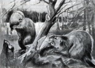 Фото 56. Американский мастодонт, одно из наиболее обычных млекопитающих Северной Америки в ледниковую эпоху, изображенный на опушке елового леса рядом с болотом Вместе с мастодонтами в зоне еловых лесов обитали лоси (особенно в заболоченных местах), гигантские лоси, ныне вымершие (рис. 69), вымершее травоядное животное, напоминавшее мускусного быка, которое было приспособлено к обитанию в лесу и в редколесье, необычайный гигантский бобр (фото 57) и другие виды грызунов, оленей, медведей и крупных кошачьих.