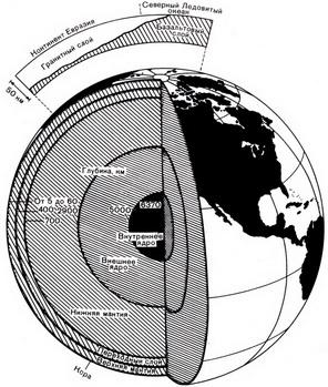 Фото 1. Вид из космоса на планету Земля. Черными линиями показано приблизительное положение берегов континентов. (Фотография сделана со спутника ATS - III, NASA) Другой отличительной особенностью Земли является, как видно на снимке, наличие воды, образующей океаны. На Луне такое вещество, как вода, не обнаружено. Хорошо известно, что вода, как и воздух, необходима для жизни. В то же время, находясь в движении, вода в реках, озерах и морях переносит частицы горных пород с одного места на другое и отлагает их в виде осадков. Со временем эти осадки становятся слоями осадочных пород. Наблюдатель, находящийся в космосе, обнаружил бы, что наличие облачности в атмосфере не позволяет ему сразу же получить представление об основных чертах земной поверхности. Для того чтобы получить представление об очертании океанов и континентов, ему пришлось бы сопоставить множество снимков, сделанных в различное время и охватывающих значительную площадь суши. На нашем снимке виден участок береговой линии, достаточно большой, чтобы понять, какая часть поверхности Земли находилась в поле зрения космической фотокамеры. Слева от центра снимка расположена южная часть Южной Америки, а справа находится отделенная от нее Атлантическим океаном огромная глыба западной Африки - ближайшей части Африканского континента. Побережья этих двух континентов, разделенных сейчас обширными пространствами воды, обнаруживают сходство очертаний, подобно двум частям головоломки, подходящим друг к другу. И в самом деле, есть серьезные основания полагать, что на более ранних стадиях истории Земли эти два континента были единым целым. Позднее они разделились и медленно движутся в разные стороны, каждый на своем основании, образуя непрерывно расширяющийся Атлантический океан. Однако представление о том, что земные материки плавают и находятся в движении, подобно плавучим льдинам, сложилось практически вне зависимости от завоевания космического пространства. Оно явилось плодом упорного труда многих ученых, работавших на поверхности самой Земли и по времени было одним из последних в длинном ряду открытий и исследований, касающихся динамики Земли и создавших основу теоретического учения о Земле. Эта теория формулирует законы, управляющие всеми процессами - физическими, химическими и биологическими, которые вызывают постоянные изменения облика Земли. Теория Земли охватывает не только движение плавающих континентов, но также и все другие процессы, происходящие на нашей планете. К этим процессам относится и перенос воды из океана на сушу через атмосферу, и обратное перемещение воды в океан реками, постепенное разрушение горных пород и перенос их частиц реками, волнами, течениями, ледниками и ветрами, которые постоянно "подметают" поверхность Земли. Энергия этих природных сил есть энергия, излучаемая Солнцем. Эта же энергия в виде отраженного от земной поверхности света дала возможность получить космическую фотографию. Внутреннее строение Земли Центр нашей планеты находится всего лишь на глубине 6370 километров, что составляет менее двух процентов расстояния до Луны, однако наибольшая глубина, на которую человек проникал в недра Земли (в золотых копях Южной Африки), составляет 3,6 километра. При разведке нефти в западном Техасе твердые породы были пробурены до глубины более 9 