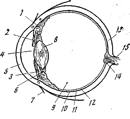 На поверхности сетчатки более или менее равномерно расположено 130 млн. палочек. В центре сетчатки — в области так называемого желтого пятна и особенно центральной ямки (непосредственно напротив зрачка) находятся преимущественно колбочки — примерно 7 млн. Такое распределение имеет особый смысл. Дневное зрение осуществляется в условиях поступления в глаз света сравнительно большой интенсивности. Пучок света, проходящий через суженный вследствие этого зрачок, попадает на небольшой участок сетчатки, расположенный в самом ее центре, т. е. на область желтого пятна. Здесь же находятся колбочки — элементы зрительного восприятия, приспособленные к видению в этих условиях. У животных, лишенных способности различать цвета, желтое пятно отсутствует. Таковы кошка, собака, золотистый хомяк и многие другие животные. Лишь некоторые породы собак обнаруживают слабые зачатки цветового зрения. Колбочек в сетчатке собачьего глаза почти совсем нет. Собаки ведут свою родословную от сумеречных хищников (волков, шакалов), которые и не нуждались в совершенном аппарате дневного, цветового, зрения. Лошади, олени, овцы, свиньи различают некоторые участки спектра, например красный и зеленый, норки — желтый и синий. Среди животных лучше всего различают цвета обезьяны, особенно шимпанзе. Рыбы в большинстве также обладают цветовым зрением. В сетчатке глаза сокола, чайки, гуся, курицы — по два желтых пятна. Одно — для рассматривания предметов Двумя глазами одновременно, другое — для удобства пользования одним глазом. Есть в глазу и слепое пятно, лишенное светочувствительных элементов. Это то место, где в глаз входит зрительный нерв, образующий сосок, хорошо видный врачу-окулисту при осмотре глазного дна. При сумеречном зрении, в условиях слабой освещенности, зрачок максимально расширяется, чтобы пропустить в глаз возможно большее количество лучей. Падая на сетчатку под различными углами, лучи освещают ее более или менее равномерно. Такой освещенности соответствует и распределение палочек по сетчатке. Способность глаза приспосабливаться к условиям различной освещенности путем изменения диаметра зрачка — адаптация (к темноте или свету) — имеет существенное значение для создания условий наилучшего видения. Если вскрыть глаз животного, длительное время находившегося в темноте, и при слабом красном свете обнажить сетчатку, она окажется пурпурного или густо-розового цвета. После непродолжительного пребывания на свету окраска исчезает, сетчатка обесцвечивается. Пигмент, придающий окраску сетчатке в темноте и исчезающий на свету, получил название зрительного пурпура, или родопсина. Исчезновение пигмента на свету было названо выцветанием пигмента. Зрительный пурпур, содержащийся в наружных члениках палочек, принимает самое активное участие в восприятии света. Адаптация глаза к темноте — это прежде всего процесс восстановления зрительного пурпура, процесс, требующий для своего завершения около получаса. Спектр поглощения родопсина имеет максимум в области голубых лучей с длиной волны 5100 А (1 А = 10-10 м). Спектр поглощения родопсина совпадает со спектром светочувствительности палочек. Родопсин — сложный белок, состоящий из собственно белка-опсина и активного центра — ретиналя. По некоторым данным, опсин — соединение белка с фосфолипидом, основ
