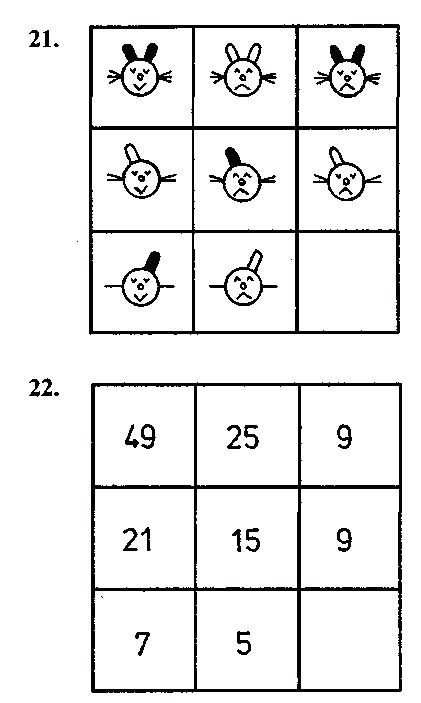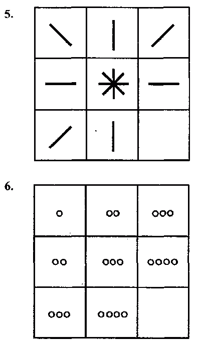 Тест V: Завершение картинки Инструкция по проведению теста Этот тест состоит из набора картинок, в которых нижний правый квадрат оставлен пустым. Попросите ребенка завершить картинку, добавив то, что, по его мнению, туда подходит. Если у него нет никакого представления, как за это приняться, вы можете показать ему, как это делается, на примере первой картинки. После этого не торопите его и не говорите ему, правильно он выполнил задание или нет. Время выполнения не ограничивается, но если после нескольких минут работы обнаружится, что ребенок очевидно застрял, помогите ему справиться и перейти к следующей задаче. Трудность задач постепенно возрастает. Когда ребенок столкнется с трудностями, ему нужно будет об этом сказать и дать понять, что более трудные задачи предназначены для более взрослых детей. Прекратите тестирование, если ребенок ошибется пять раз подряд. ![]() ![]() ![]() ![]() ![]() ![]() ![]() ![]() ![]() ![]() ![]() ![]() ![]() ![]() ![]() Подсчет баллов по тесту V Правильные ответы: ![]() ![]() Чтобы получить «картиночный коэффициент» ребенка, подсчитайте число правильных ответов и соотнесите его с приведенной ниже таблицей. Для интерпретации этого коэффициента обратитесь к последней главе книги. Картиночные коэффициенты![]() *Используйте эту колонку для детей в возрасте от 5 лет 0 месяцев до 5 лет и 11 месяцев; аналогичным образом используются остальные колонки. |