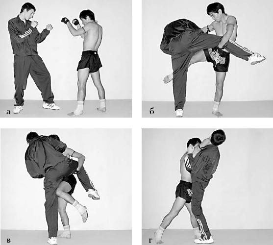 ГЛАВА 7 Самооборона с использованием приемов таиландского бокса Приемы таиландского бокса эффективны при самообороне в конфликтных ситуациях, если их использовать правильно и обдуманно. Очень важно развить умение определять уровень опасности, угрожающей вам. Прежде всего, необходимо попытаться предотвратить столкновение, и только в случае неудачи применять силу. При конфронтации старайтесь применять тот уровень воздействия на противника, которого будет достаточно для нейтрализации угрозы и предотвращения опасности. Опытный тайбоксер не имеет нужды калечить или даже убивать своего противника и способен остановить агрессию быстро и эффективно. Развивайте в себе гуманность к ближнему даже во время серьезного столкновения. Уровень вашей физической и психологической подготовки будет определять ваши способности в умении брать под контроль ту или иную ситуацию, а также использовать все свои возможности и правильную оценку ситуации для разрешения конфликта. Если вы поняли, что конфронтация неизбежна, защищайтесь и контратакуйте наиболее простым и коротким способом, исходя из сложившейся ситуации. Контролируйте силу своих ответных действий для предотвращения травм. Бейте правильно, поражая уязвимые места на теле противника, чтобы в максимально короткое время остановить агрессию и взять полный контроль над ситуацией. Если вы не можете быстро и эффективно нейтрализовать противника в течение нескольких секунд после нападения или ваши ответные удары будут недостаточно сильными или мощными и противник сможет от них защититься, то вы будете вовлечены в рукопашный бой, в котором вам придется использовать все свои умения и навыки. Вот почему так важно сразу же нейтрализовать противника, не дав ему возможность развить агрессию. Далее представлены примеры применения приемов таиландского бокса для самообороны от невооруженного противника. Самооборона от противника, вооруженного холодным или огнестрельным оружием, требует специальной подготовки и в данной главе не рассматривается. Приемы самозащиты сгруппированы по принципу ответных действий таким образом, чтобы показать наиболее эффективные приемы таиландского бокса для самообороны. Поэтому действия нападающего не классифицированы по видам атак, а представлены в произвольном порядке. Защита от бокового удара левой рукой в голову Техника выполнения: примите боевую стойку. Выполните подставку предплечья правой руки на верхнем уровне. Нанесите боковой удар левым локтем в голову. Нанесите боковой удар правым локтем в голову. Нанесите удар сверху вниз левым локтем в горло с одновременным захватом головы противника правой рукой. Фото 238. Защита от бокового удара левой рукой в голову Защита от бокового удара правой рукой в голову Техника выполнения: примите боевую стойку. Выполните отбив левой рукой. Нанесите боковой удар правым локтем в голову с одновременным захватом правой руки противника. Выполните захват за голову правой рукой и нанесите прямой удар правым коленом в голову. Фото 239. Защита от бокового удара правой рукой в голову Защита от бокового удара левой ногой в туловище Техника выполнения: примите боевую стойку. Выполните захват ноги и одновременно нанесите боковой удар левой рукой в голову. Не отпуская ногу, нанесите боковой удар правой ногой в бедро. Вы