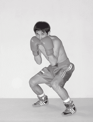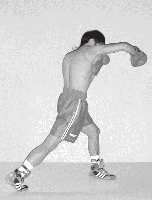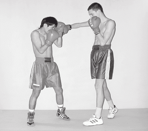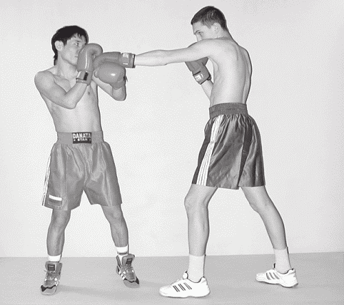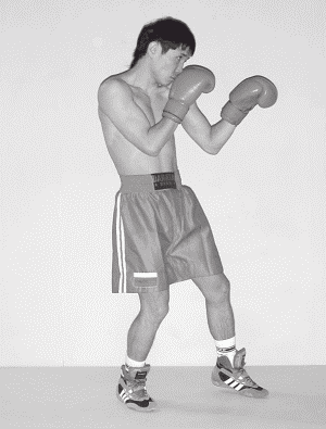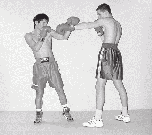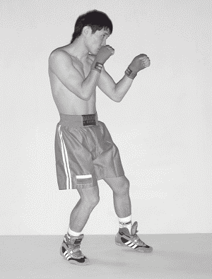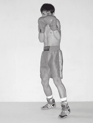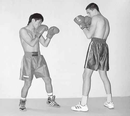 Глава вторая Техника бокса Техника основных положений боксера К технике основных положений боксера относят боевое положение кулака, боевую стойку, передвижения и боевые дистанции. Боевое положение кулака Правила бокса разрешают наносить удары только сжатым кулаком в специальной боксерской перчатке с мягкой волосяной набивкой. При ударе кисть получает значительную нагрузку, поэтому необходимо правильно сжимать ее в кулак. Для того, чтобы правильно сжать кисть в кулак, согните пальцы и прижмите их к ладони, большой палец прижмите к средней фаланге указательного. ![]() ![]() ![]() ![]() Фото 1. Последовательность формирования кулака Боевая стойка Боевая стойка – оптимальное исходное положение, при котором боксер выполняет какие-либо действия в процессе поединка. От правильности освоения боевой стойки во многом зависит и освоение остальных движений. Боевая стойка в процессе боя может меняться в зависимости от активности боя, дистанции, ситуации в обороне, атаке и контратаке. Различают три разновидности стоек: левостороннюю (которую обычно применяют боксеры-правши, в дальнейшем мы будем рассматривать только левостороннюю боевую стойку, как наиболее распространенную в боксе); правостороннюю (которую наиболее часто используют боксеры-левши); фронтальную или учебную. Обучение следует начинать с фронтальной (учебной) стойки. Фронтальная (учебная) стойкаТехника выполнения Ноги расставлены на одной линии по ширине плеч, ступни параллельны. Руки свободно согнуты в локтях, голова опущена, живот втянут. Вес тела равномерно распределен на обе ноги. Эта позиция имеет преимущественно учебное значение, в которой усваиваются основные движения боксером. В бою ее применяют при сближении, в особенности для преследования противника. ![]() ![]() Фото 2. Фронтальная стойка Левосторонняя боевая стойка (основная)Техника выполнения При левосторонней боевой стойке левая нога находится впереди. Правая нога находится на один шаг сзади и на полшага вправо. Стопы параллельны, ноги слегка согнуты в коленях. Вес тела равномерно распределен на обе ноги, но чуть больше нагружена правая нога. Туловище несколько отклонено назад. Левая рука, согнутая в локте, вынесена перед туловищем, при этом локоть опущен, левый кулак находится примерно на уровне плечевого сустава. Правая рука, согнутая в локте, располагается перед грудью. Локоть опущен, правый кулак находится справа у подбородка и повернут внутрь. ![]() ![]() ![]() ![]() Фото 3. Левосторонняя боевая стойка Правосторонняя боевая стойкаТехника выполнения При правосторонней боевой стойке правая нога ставится впереди, левая – сзади. Расстояние между стопами равно примерно ширине плеч. Ноги слегка согнуты в коленях. Вес тела равномерно распределен на обе ноги, но чуть больше нагружена левая нога. Туловище несколько отклонено назад. Правая рука, согнутая в локте, вынесена перед туловищем, при этом локоть опущен, правый кулак находится примерно на уровне плечевого сустава. Левая рука, согнутая в локте, располагается перед грудью. Локоть опущен, левый кулак располагается слева у подбородка и повернут вовнутрь. Основные ошибки при изучении боевой стойки • Перегруженность правой или левой ноги. • Ноги не согнуты в коленях. • Ноги широко расставлены. • Локти широко расставлены в стороны. • Расставленные широко в стороны локти. 
