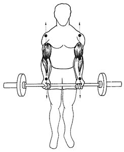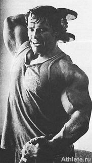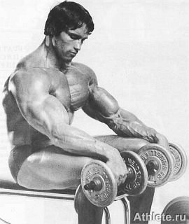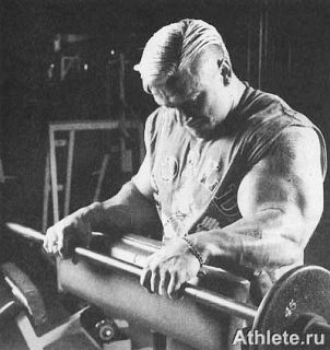 Дейв Дрейпер демонстрирует позу, в которой развитие мышц внутренней части предплечья имеет крайне важное значение. Упражнения для рук — бицепсы СГИБАНИЕ РУК СО ШТАНГОЙ СТОЯЦель упражнения: Развитие размера и массы бицепсов. Это основное и самое популярное упражнение для бицепсов. Выполнение: (1) Встаньте, расставив ноги на ширине плеч, и возьмите штангу нижним хватом. Опустите штангу на вытянутых руках перед собой. (2) Согните руки в локтях и поднимите штангу по широкой дуге как можно выше, удерживая локти близко к туловищу в неподвижном положении. Дуга должна быть длинной и широкой; поднимая штангу прямо вверх, вы сильно упрощаете движение. Полностью напрягите бицепсы в верхней части. Опустите штангу по той же дуге, пока руки не выпрямятся полностью. Небольшие движения туловища в этом упражнении приемлемы, поскольку оно предназначено для наращивания массы, но их нужно свести к минимуму, если вы специально не занимаетесь «читтингом». Наклоны вперед и назад сужают диапазон движения. Для наращивания максимальной массы и работы с полным объемом бицепсов выполняйте сгибание рук со штангой, держа руки на ширине плеч. Обратите внимание, что при этом бицепсы и предплечья находятся на одной линии. Правильное исходное положение для сгибания рук со штангой. Вы стоите прямо, локти у туловища, руки полностью выпрямлены, чтобы потянуть бицепсы. Правильное конечное положение для сгибания рук со штангой: туловище прямое, без раскачивания, локти неподвижны. Это заставляет бицепсы выполнять весь объем работы без помощи мышц спины и плечевого пояса. Обратите внимание, что, когда вы держите локти неподвижно, на вершине движения ваши руки по-прежнему находятся под углом от вертикали. Это означает, что мышцам приходится постоянно поддерживать вес вместо того, чтобы отдыхать, пока кости и сухожилия выполняют их работу. Смотрите, что происходит, когда вы поднимаете плечи во время сгибания рук со штангой. Вместо изоляции и разработки бицепсов, вы нагружаете переднюю головку дельтовидной мышцы, что противоречит цели упражнения. Еще одна проблема, возникающая в том случае, когда вы поднимаете локти при сгибании рук со штангой. В конце движения предплечья перпендикулярны полу, а это означает, что кости и сухожилия удерживают вес штанги, а бицепсы вообще не выполняют никакой работы. СГИБАНИЕ РУК НА «АРМ-БЛАСТЕРЕ» (ПО ВЫБОРУ) Сгибание рук с помощью «арм-бластера» — к сожалению, этот образчик спортивного снаряжения не часто можно увидеть в наши дни — это очень строгий способ разработки бицепсов, который сводит «читтинг» к минимуму. Пользуясь поясным упором для локтей, вы получаете тот же результат, что и на изолирующей скамье: локти совершенно неподвижны, бицепсы четко изолированы. СГИБАНИЕ РУК С "ЧИТТИНГОМ" Цель упражнения: Развитие дополнительной массы и силы бицепсов. Выполнение: Встаньте в исходном положении для сгибания рук со штангой. Снаряд должен быть достаточно тяжелым, чтобы вы могли сделать не более 3–4 повторений со строгой техникой движения. Затем вы начинаете раскачиваться, помогая бицепсам поднимать вес мышцами спины и плечевого пояса. Трюк заключается в том, чтобы ваши бицепсы по-прежнему работали на пределе возможного, а помощь других мышц сводилась лишь к продолжению серии. Держите локти неподвижно на уровне талии. Мне нравится соч