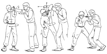 – не следует пытаться изменить вектор силы противника, так как, применяя силу при попытках изменить направление удара, защищающийся рискует потерять равновесие; – при скручивании основное количество движений нужно производить тазом. Методы тренировки: – сопротивление силе, то есть на первых этапах тренировки защиты нужно попытаться лишь сопротивляться силе и натиску условного противника; – уступка давлению силы и определение ее вектора. Нужно пытаться проводить защитные приемы, сохраняя вектор силы противника; – скручивание и продолжение вектора силы противника по касательной к своему телу. При отработке этих приемов уделяйте больше внимания своим движениям. Защита от бокового удара палкой скручиванием рук в плечах Если рассматривать палку в руках бойца с точки зрения физики, то можно отметить, что максимальным количеством кинетической энергии обладает свободный конец этого орудия. Именно на данном свойстве и строится защита, три способа которой мы сейчас и рассмотрим: 1. Если вы находитесь в радиусе действия конца палки, переместитесь вперед к руке противника, в «мертвую зону» удара (в боксе, например, боец часто использует этот нехитрый прием, если выходит на линию прямого удара противника), и атакуйте. 2. Если вы находитесь в радиусе действия конца палки, отступите назад или отклонитесь в сторону от удара. 3. Самый примечательный случай, когда вы находитесь вблизи середины палки, следует рассмотреть подробнее. Палка находится в правой руке противника, следовательно, удар наносится слева направо. При таком ударе вектор силы противника направлен на уровень ваших пояса, плеч или головы в плоскости, параллельной земле. Если вы расслабитесь, то цепочка ваших инстинктивных движений будет такой: отступление на шаг вправо, отклонение от палки с последующим намерением выбить или отвести оружие рукой. ![]() Рис. 7. Защита от бокового удара палкой скручиванием рук в плечах Бесполезно подробно описывать прием, ведь ситуации бывают разными, поэтому приведем только его основные элементы (рис. 7). Отступите на шаг вправо по окружности направления вектора силы, одновременно встречая палку внешней стороной правой ладони. Далее ведите ее на себя возвратно-поступательным движением правой руки в плоскости удара (это должно быть движение влево по касательной к задней поверхности левого плеча). Плечо скручивайте против часовой стрелки, правую руку все время прижимайте к телу. При этом корпус нужно также скручивать против направления часовой стрелки и подсаживаться влево под удар, перенося вес тела на левую ногу. Затем разгрузите ее и разверните на носке правую ногу. Голову опустите вниз к правому плечу. Сделайте выдох. ![]() Рис. 8. Защита от удара ногой скручиванием в плечах ![]() Рис. 9. Скольжение палки по ребру ладони и предплечья ![]() Рис. 9 (продолжение). Скольжение палки по ребру ладони и предплечья Далее идет продолжение скручивания плеч. Энергия скручивания правой руки переходит на левую, переводя точку контакта палки с телом на левое плечо. Лопатки при этом сводятся максимально близко друг к другу, голова опущена вниз. Начинайте скручивание левой руки, а ее поступательное движение ведите по ходу палки влево. Руку скручивайте против часовой стрелки, при этом кисть из положения ладонью вниз переходит в положение ладонью вверх и перехват