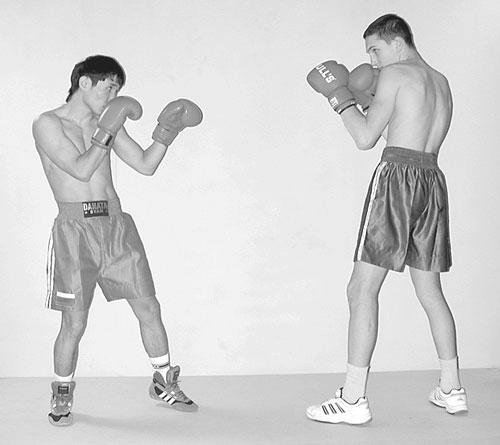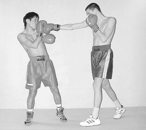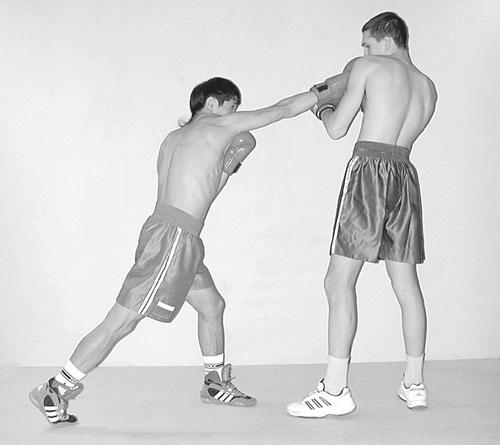 Глава 7 Комбинации и серии из прямых ударов Двухударные комбинации из прямых ударов Двухударными комбинациями из прямых ударов в голову и туловище в основном пользуются с дальней и средней дистанции. Комбинация из прямых ударов левой и правой рукой в голову условно получила название «раз-два». В зависимости от ситуации боя на ринге и тактических задач различные комбинации из прямых ударов в голову и туловище можно применять в атакующей, встречной и ответной формах. Прямые удары левой и правой рукой в голову с шагом впередТехника выполнения Из дальней дистанции толчком носка правой ноги перенесите вес тела на впередистоящую левую ногу, с одновременным вышагиванием левой ногой вперед. Быстро преодолевая дистанцию до противника, шаг делается с носка на полную ступню. Одновременно, вращая туловище слева-направо, резко выпрямляя левую руку и направляя кулак к цели, нанесите прямой удар в голову противника. В момент удара сильно разверните плечевой пояс левым плечом вперед, создавая удобное положение для следующего акцентированного удара правой рукой. Затем, вращая туловище справа-налево и полностью перенеся вес тела на левую ногу, быстро направьте правую руку прямолинейно в цель. В момент нанесения удара, кулак, крепко сжатый в лучезапястном суставе, наклоняется вперед. Левая рука подтягивается локтем к туловищу. Как только два прямых удара будут нанесены, немедленно вернитесь в исходное положение. ![]() ![]() ![]() Фото 80. Прямые удары левой и правой рукой в голову с шагом вперед Прямые удары левой и правой рукой в туловище с шагом впередТехника выполнения Из дальней дистанции толчком носка правой ноги перенесите вес тела на левую ногу, с одновременным вышагиванием левой ногой вперед. Одновременно, вращая туловище слева-направо и наклоняясь вперед-вправо, нанесите прямой удар левой рукой в туловище. Подтягивая левую руку локтем к туловищу, не поднимая туловище и подтягивая правую ногу нанесите прямой удар правой рукой в туловище, полностью перенеся вес тела на левую ногу. После завершения комбинации немедленно вернитесь в исходное положение. ![]() ![]() ![]() Фото 81. Прямые удары левой и правой рукой в туловище с шагом вперед Прямые удары правой и левой рукой в головуТехника выполнения Комбинация из двух прямых ударов правой и левой в голову может быть успешно проведена при выполнении предварительного финта левой рукой. Из дальней дистанции выполните шаг левой ногой вперед, одновременно, вращая туловище справа-налево и перенося полностью вес тела на левую ногу, нанесите прямой удар правой рукой в голову. Затем перенесите вес тела на правую ногу и, отклоняя туловище назад, нанесите прямой удар левой рукой в голову. Прямой удар левой в голову с переносом веса тела на сзадистоящую правую ногу применяется от ответных действий противника. ![]() ![]() ![]() Фото 82. Прямые удары правой и левой рукой в голову Трехударные серии из прямых ударов Серию ударов нельзя применять шаблонно, ее нужно использовать сознательно на определенной дистанции боя и определенными средствами техники и тактики. Каждая серия имеет свой порядок чередования ударов. Каждый удар серии должен поражать определенную цель. Паузы между ударами могут быть различными. Особое значение при проведении серии ударов имеет быстрота их выполнения и длительности пауз между нанесени
