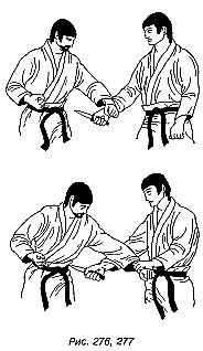 Урок 54 1 Разминка. 2. Повторить упражнения для повышения чувствительности пальцев и улучшения согласованности движений рук в лучезапястных суставах в приемах с ножом. 3. Повторить способы освобождения от захватов и прорывы защиты партнера, разученные на уроках 50–53. 4. Разучить способ прорыва защиты партнера при атаке ножом сверху. Оба партнера стоят друг против друга. Атакующий правой рукой проводит колющий удар ножом сверху. Защищающийся выполняет левым предплечьем верхний блок в предплечье атакующей руки. Атакующий тянет на себя ножом левую руку партнера, перехватывает ее за запястье одноименной рукой и проводит повторную атаку режущим ударом по горлу (рис. 271, 272). Выполнить 20 раз и поменяться ролями. 5. Повторить подготовительные упражнения с мечом, направленные на согласование взаимодействия между верхними и нижними конечностями. 6. Повторить приемы повторной защиты, разученные на уроках 50–53. 7. Разучить новый прием повторной защиты от колющего удара мечом в среднюю часть туловища. Оба партнера стоят в боевой правосторонней стойке. Атакующий наносит колющий удар мечом в среднюю часть туловища защищающегося. Защищающийся делает скользящий шаг в сторону правой ногой, проводит своим мечом средний блок изнутри в меч партнера, делает шаг вперед левой ногой, проводит сильный удар мечом сверху вниз по оружию партнера и контратакует его колющим ударом в голову (рис. 273–275). Выполнить 20 раз и поменяться ролями.
