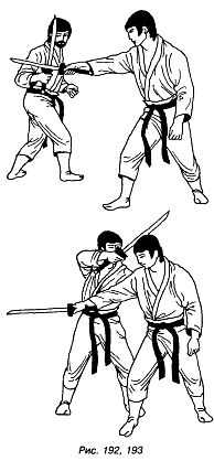 Урок 37 1. Разминка. 2. Повторить упражнения для повышения чувствительности пальцев и улучшения согласованности движений рук в лучезапястных суставах в приемах с ножом. 3. Повторить приемы защиты против атакующих действий ножом, разученные на уроках 33–36. 4. Разучить болевой прием перегибанием локтя против естественного сгиба в качестве защиты от прямого колющего удара ножом в грудь. Оба партнера стоят друг против друга. Атакующий правой рукой наносит колющий прямой удар ножом в грудь защищающегося. Защищающийся делает шаг вперед-в сторону с поворотом туловища вправо, захватывает кисть атакующей руки партнера, поднимает ее локтем вверх, затем резко опускает вниз, заваливает атакующего на грудь и обезоруживает (рис. 189–191). Выполнить 20 раз и поменяться ролями. 5. Повторить подготовительные упражнения с мечом, направленные на согласование взаимодействия между верхними и нижними конечностями. 6. Повторить приемы фехтования мечом, разученные на уроках 33–36. 7. Разучить новый прием защиты от бокового удара мечом слева направо в правое плечо. Атакующий делает выпад правой ногой и наносит боковой удар мечом слева направо в правое плечо защищающегося. Защищающийся делает левой ногой скользящий шаг влево и подтягивает к ней правую ногу до исходного положения, одновременно проводя своим мечом средний блок снаружи в меч парнера. Затем делает небольшой шаг вперед правой ногой и атакует рубящим ударом меча в голову (рис. 192, 193). Выполнить 20 раз и поменяться ролями.
