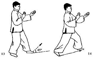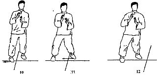 Перемещения При наступлении 1. Принимается правосторонняя стойка (рис. 1). 2. Не меняя положения рук, следует сделать полный шаг вперед правой ногой (рис. 2) и затем пол-шага левой ногой (рис. 3). При отступлении Сделайте движение, обратное наступательному; из правой стойки (рис. 4) левая нога скользит назад (рис. 5) и затем делается полшага назад правой ногой (рис. 6). При шаге влево 1. Следует принять правостороннюю стойку (рис. 7). 2. Левая нога скользит влево по прямой линии (рис. 8). 3. Делается пол-шага правой ногой (рис. 9). При шаге вправо 1. Необходимо принять правостороннюю стойку (рис. 10). 2. Правая нога скользит вправо по прямой линии (рис. 11). 3. Делается пол-шага левой ногой (рис. 12). Зигзагообразное перемещение. Исходное положение: Примите левостороннюю переднюю стойку (рис. 13). Выполните передней ногой шаг по углом 45° к линии соединяющей Ваши пятки или к фронтальной линии. Перенесите вес тела на левую ногу и подтяните правую к левой (рис. 14, 15). Не останавливаясь, шагните правой ногой под углом в 90° к линии первоначального перемещения. При этом смените положение рук т. е. правую выдвиньте вперед, а левую подтяните к корпусу (рис. 16). Подшагните левой ногой к правой так, чтобы принять правостороннюю стойку (рис. 17). Теперь выполните описанные выше действия в симметричном отображении. В результате Вы окажетесь в левосторонней стойке. Далее перейдите в правостороннюю стойку, затем в левостороннюю и т. д. Все время перемещайтесь вперед. Траектория перемещения изображена на рис. 18. Повороты на месте. Данная техника имеет важное значение в стиле ВИН ЧУН. Отрабатывается она буквально с первых тренировок. Во вьетнамском направлении школы ВИН ЧУН первые полгода ученики около половины тренировочного времени используют на отработку данной техники. Повороты на месте развивают способность уводить тело с линии атаки. Перейдем к описанию упражнений. Примите фронтальную стойку. Руки согните и подтяните к груди (рис. 19). Развернитесь на всей стопе вправо на 45°. Вес тела перенесите на левую ногу, правая почти свободна. Вы приняли боковую фронтальную стойку (рис. 20). Теперь развернитесь влево на 90°. Вес тела перенесите на правую ногу (рис. 21). Теперь развернитесь вправо (рис. 20) и затем снова влево (рис. 21) и так много раз. За тренировку необходимо выполнять не менее сотни поворотов. В последствии это число увеличивается. Рекомендуется использовать отягощение, прикрепляемое к поясу. Уход с линии атаки (смена стойки). Примите переднюю правостороннюю стойку. При этом правая рука выдвинута вперед, а левая располагается ближе к телу (рис. 22). Подтяните правую ногу к левой, а затем переместите ее вправо, принимаю фронтальную стойку (рис. 23). Не останавливаясь, перенесите вес тела на правую ногу, левую подтяните к правой и затем выдвиньте вперед, принимая переднюю левостороннюю стойку (рис. 24). При постановке левой ноги вперед происходит смена рук. Левая выдвигается вперед, а правая отводится к телу. Теперь выполните переход из левосторонней стойки в правостороннюю. Все действия выполняются по выше описанной схеме, только в обратном порядке. Переход из стойки в стойку необходимо выполнять большое количество раз. Это научит Вас умению уходить с линии атаки и заходить с фланга к противнику для проведения своей атаки. |
