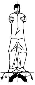 Глава 1. Стойки и перемещения Постижение стиля Вин Чун начинают с изучения стоек и перемещений. По традиции, данному разделу базовой техники следует отвести первые полгода занятий. В это время никакая другая техника не изучается. Такова традиция, и каждый, кто желает в совершенстве овладеть боевым искусством, должен следовать ей неукоснительно. Под понятием «стойка» подразумевается положение ног, еще точнее — ступней. Основное требование к стойке — она должна быть удобной и стабильной. В любой стойке боец должен иметь возможность включить в удар все тело, а также быстро перейти в другую стойку. Правильность стойки зависит от позиции всего тела, от положения спины, головы, бедер и многого другого. В Вин Чун изучается одна единственная стойка, которая имеет три варианта. Это фронтальная стойка (рис. 1), Рис. 1 боковая фронтальная (рис. 2) Рис. 2 и передняя (рис. 3). Рис. 3 Джор Ма Бу — таково название стойки. Нетрудно заметить, что характерной особенностью Джор Ма Бу является высокое расположение центра тяжести относительно поверхности. Это позволяет быстро и свободно передвигаться в любом направлении. Рассмотрим теперь по порядку все три варианта стойки. Фронтальная ДЖОР МА БУ Эта стойка является тренировочной. Она используется в тренировочном процессе для отработки базовой техники, а также в большинстве парных упражнений Чи Сау, Лап Сау и других. Способ принятия стойки Из исходного положения (рис. 4) согните немного ноги в коленях (рис. 5), Рис. 4, 5 разведите носки стоп в стороны под углом в 45° (рис. 6), Рис. 6 а затем разведите пятки в стороны под углом в 90° (рис. 7). Рис. 7 Вы приняли фронтальную стойку Джор Ма Бу. Основные требования к стойке: 1. Вес тела равномерно распределен на обе ноги. 2. Обе стопы плотно стоят на земле, образуя форму треугольника. 3. Колени немного согнуты и направлены внутрь. 4. Таз подан вперед. 5. Корпус выпрямлен. 6. Голова на одной линии с туловищем. Фронтальная боковая ДЖОР МА БУ Данная стойка, как и фронтальная, используется в тренировочном процессе очень часто. Вместе с тем, она часто незаменима в реальном поединке. Способ принятия стойки Из фронтальной стойки (рис. 8) Рис. 8 совершите поворот корпусом влево. При этом стопа левой ноги разворачивается на 90° влево, вес тела полностью смещается на правую ногу. Правое плечо выдвигается вперед относительно фронтальной линии, благодаря естественному повороту корпуса влево. Вы приняли боковую фронтальную правостороннюю стойку Джор Ма Бу (рис. 9). Рис. 9 Левосторонняя стойка симметрична правосторонней. Основные требования к стойке: 1. Вес тела полностью сосредоточен на одной ноге. 2. Стопы параллельны. 3. Колени направлены внутрь. 4. Корпус немного отклонен от вертикальной линии. Передняя ДЖОР МА БУ Эта стойка наиболее приспособлена к ведению реального поединка, поэтому можно сказать, что это боевая стойка. Способ принятия стойки Из боковой фронтальной правосторонней стойки (рис. 10) перенесите вес тела на левую ногу, правую подтяните к левой и выведите вперед (рис. 11). Вы приняли правостороннюю переднюю стойку (рис. 12, вид сбоку). Рис. 10–12 Левосторонняя стойка симметрична правосторонней. Основные требования к стойке: 1. Вес тела полностью сосредоточен на заднестоящей ноге. 2. Стопы параллельны. 3. Ноги немного согнуты в коленях. Колени направлены внутрь и как бы притягиваются друг к другу. 4. 