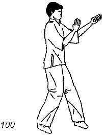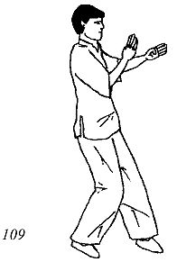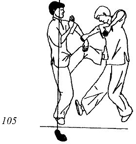 Глава 3. Техника ног Хотя техника ног в Вин Чун не изобилует большим количеством ударов, в реальном поединке она очень эффективна и практична. Удары наносятся не выше солнечного сплетения и ориентированы на поражение уязвимых мест, к которым относятся: голень, колено, пах. Прямой удар Это основной удар, который наиболее часто используется на практике. Выполнение Примите левостороннюю переднюю стойку (рис. 100). Быстро поднимите левую ногу, согнутую в коленном суставе, так чтобы бедро расположилось выше горизонтальной линии (рис. 101). Выпрямите ногу, нанося прямой удар вперед (102). Обратите внимание на следующие моменты: — ударной поверхностью является пятка, носок стопы должен быть направлен строго вверх; — опорная нога немного согнута в колене; — стопа опорной ноги полностью соприкасается с поверхностью земли (пола); — в конечной фазе удара необходимо полностью напрячь мышцы бедра; — после удара нога опускается вниз и принимается передняя стойка. На тренировке выполняйте удар как переднестоящей ногой, так и заднестоящей. Наиболее часто прямой удар используется для поражения паха и солнечного сплетения противника. Пример реальной ситуации Противник захватывает вашу руку и готовится нанести удар левой рукой (рис. 103, 104). Вы тянете противника на себя, используя движение Бон Сау, и одновременно левой ногой наносите прямой удар в солнечное сплетение противника (рис. 105). Прямой стопорящий удар Используется для пресечения атаки путем нанесения удара в опорную ногу противника. Как правило, поражается коленный сустав или голень ноги. Выполнение Примите левостороннюю переднюю стойку (рис. 106). Быстро поднимите левую ногу, согнутую в коленном суставе (рис. 107) и распрямите ее, нанося удар вперед (рис. 108). Основные требования при выполнении удара соответствуют тем, что предъявляются к выполнению прямого удара. Разница заключается лишь в том, что носок стопы направлен не строго вверх, а немного в сторону. Боковой удар Используется для поражения голени и коленного сустава ноги. Выполнение Примите левостороннюю переднюю стойку (рис. 109). Поднимите левую ногу, бедро должно располагаться выше горизонтальной линии (рис. 110). Немного разверните корпус вправо и нанесите боковой удар левой ногой (рис. 111). Основные требования — ударной поверхностью является ребро стопы, ближе к пятке. Носок направлен в сторону; — опорная нога немного согнута в коленном суставе. Стона полостью соприкасается с поверхностью земли (пола); — корпус немного повернут относительно фронтальной линии; — не отклоняйте туловище назад. Тренировка ударов ногой в воздух предусматривает несколько вариантов: 1. Быстрое выполнение ударов с полной концентрацией силы в конце движения. 2. Медленное выполнение ударов с задержкой в конечном положении на 1–2 секунды. 3. Выполнение серии из двух-трех ударов в быстром и медленном темпе, без опускания ноги на землю. Рекомендуется использовать утяжелители весом 2–3 кг, прикрепляемые к щиколотке ноги. В день необходимо выполнять как минимум по 50–70 ударов всех трех типов каждой ногой. Сила удара ногой отрабатывается на настенном мешке и деревянном столбе. Упражнение 1 Примите правостороннюю переднюю стойку. Расположитесь возле настенного мешка на расстоянии 1 метра (рис. 112). Нанесите переднестоящей ногой (правой) прямой удар по мешку (рис 113, 114). 