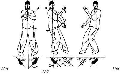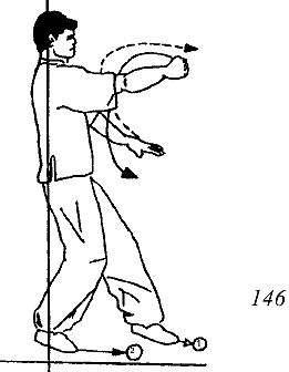 Глава 4. Комбинационная техника Изучение комбинационной техники представляет собой более сложный этап в постижении искусства поединка. Необходимо досконально изучить и овладеть практически всеми элементами базовой техники, прежде чем приступать к разучиванию комбинационных действий. В данной главе будет рассмотрено семь основных комбинационных техник. 1. ТАН САУ, НОУ МУН ЧУЙ Примите фронтальную стойку. Руки располагаются перед грудью в основной защитной позиции: правая рука в позиции Мань Сау, левая — в позиции У Сау. Повернитесь вправо на 45°, принимая левостороннюю боковую фронтальную стойку. Одновременно с поворотом правая рука выполняет блок Тан Сау, а левая — удар Ноу Мун Чуй. Поворот, блок и удар должны слиться в единое движение (рис. 135). Вернитесь в исходное положение. Правая рука принимает позицию У Сау, а левая — позицию Мань Сау (рис. 136). Продолжите упражнение, совершая поворот на 45° влево. Одновременно с поворотом левая рука выполняет блок Тан Сау, а правая наносит удар Ноу Мун Чуй. Вернитесь в исходное положение (рис. 134). Повторите по 20 раз, разворачиваясь в правую и левую сторону. В дальнейшем фазу принятия исходного положения можно опустить. В результате вы будете совершать повороты сразу на 90° слева направо и наоборот. Данная комбинация предусматривает одновременную защиту и атаку (рис. 137). Изучив движение рук при повороте на месте, необходимо перейти к отработке комбинации с использованием приставного шага. Выполнение Примите левостороннюю переднюю стойку (рис. 138). Шагните левой ногой вперед, подтяните правую ногу и одновременно выполните левой рукой блок Тан Сау, а правой рукой — удар Ноу Мун Чуй (рис. 139). Переместитесь вперед используя приставной шаг. Руки меняются ролями и теперь правая выполняет блок Тан Сау, а левая — удар Ноу Мун Чуй (рис. 140). Продолжайте совершать перемещения вперед с одновременными действиями руками. Одновременный блок и удар могут выполняться и при движении назад. Данную комбинацию можно выполнять, используя зигзагообразный шаг. 2. ГАН САУ, НОУ МУН ЧУЙ Примите фронтальную стойку. Правая рука в позиции Мань Сау, левая в позиции У Сау (рис. 141). Повернитесь вправо на 45°, принимая левостороннюю боковую фронтальную стойку. Одновременно с поворотом правая рука выполняет блок Ган Сау, а левая наносит удар Ноу Мун Чуй (рис. 142). Вернитесь в исходное положение, поменяв положение рук (рис. 143). Повернитесь влево на 45°, принимая правостороннюю боковую фронтальную стойку. Одновременно с поворотом правая рука наносит удар Ноу Мун Чуй, а левая выполняет блок Ган Сау. Повторите упражнение по 20 раз, разворачиваясь вправо и влево. Одновременность защиты и атаки дает больше шансов на победу в реальном поединке (рис. 144). Следующий этап — освоение комбинации в сочетании с приставным шагом. Выполнение Примите левостороннюю переднюю стойку (рис. 145). Выполните перемещение вперед приставным шагом. Левая рука выполняет блок Ган Сау, а правая наносит удар Ноу Мун Чуй (рис. 146). Переместитесь вперед еще на один шаг. При этом правая рука выполняет блок Ган Сау, а левая наносит удар Ноу Мун Чуй (рис. 147). Выполняя движение вперед, вы постоянно должны оставаться в левосторонней стойке. Выполнив 8-10 перемещений, развернитесь на 180°, примите правостороннюю переднюю стойку и повторите комбинацию необходимое количество раз (8-10). 3. 