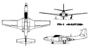 Истребитель «Фантом» К концу 1943 г. на заводе фирмы МакДоннелл в г. Сент Луис было изготовлено два прототипа нового истребителя и один планер для статических испытаний. 25 января 1944 г. опытный самолет, получивший первоначально индекс XFD-1 и собственное имя «Фантом», совершил первый полет. После завершения заводских испытаний оба прототипа были облетаны летчиками ВМС США на полигоне в Патуксент-Ривер. Испытания прошли безаварийно, их результаты в целом удовлетворили представителей заказчика. Отмечалась лишь чересчур большая взлетная дистанция и низкая скороподъемность на уровне моря, обусловленные низкой тяговооруженностью. Эти недостатки делали проблематичной эксплуатацию «Фантома» на авианосцах. Для улучшения взлетных характеристик было решено оснастить самолет ракетными ускорителями JATO, сбрасываемыми после взлета. 7 марта 1944 г. фирма МакДоннелл получила от ВМС заказ на производство 100 самолетов. Первый взлет с палубы авианосца «Франклин Д. Рузвельт» опытная машина совершила 21 июля 1946 г. Служба С развертыванием серийного производства возникли проблемы - у фирмы не хватало мощностей. В связи с этим первый серийный самолет, чей индекс был к тому времени изменен на FH-1, был сдан ВМС уже после окончания войны - в ноябре 1946 г. «Фантом» стремительно устаревал. Заказ был сокращен до 60 самолетов. Последний из них был передан ВМС США 27 мая 1948 г. Самолеты поступили на вооружение одной строевой эскадрильи, но базировались в основном на береговых базах. Большая часть «Фантомов» поступила в распоряжение Центра ВМС США Патуксент-Ривер. где они использовались до начала 50-х годов в качестве учебных благодаря простоте пилотирования и неплохим посадочным характеристикам. В конце своей карьеры все «Фантомы» были переклассифицированы в летающие мишени и постепенно уничтожены. Техническое описание Самолет FH «Фантом» представлял собою двухдвигательный цельнометаллический одноместный низко-план с прямым крылом и горизонтальным оперением. Фюзеляж - цельнометаллический монокок. В носовой части находится вооружение - четыре 12,7-мм пулемета Кольт-Браунинг М-3 с боекомплектом в 400 патронов на ствол, патронные ящики, кабина летчика и колодец носовой стойки шасси, а также отсек радиооборудования. Под носовой частью самолета имеются две радиомачты, между которыми натянута антенна. Кабина летчика имеет бронеспинку толщиной 12,7 мм и переднюю бронезащиту - шпангоут той же толщины. Кабина имеет каплевидный беспереплетный фонарь, обеспечивающий хороший обзор назад. Для входа и выхода летчика фонарь сдвигается назад. Козырек кабины - с большим количеством переплетов, без бронестекла. За кабиной находится отсек топливных баков. Вертикальное оперение составляет единое целое с хвостовой балкой. Перед лонжероном вертикального оперения имеется резиновый ролик - пята для предотвращения повреждений хвостовой части самолета при превышении допустимого угла атаки на взлете и посадке. Крыло - двухлонжеронное, имеет ламинарный скоростной профиль. Конструктивно состоит из центроплана и двух консолей. В утолщенном центроплане, плавно переходящем в фюзеляж, расположены ниши основных стоек шасси, а также тракты ТРД. Двигатели Вес-тингауз 19В (позднее получили индекс J-30WE-20) «Янки» тягой по 619 кгс (на прототипах) и 730 юг (на серийных машинах) крепятся к заднему лонж
