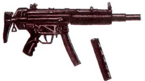 Винтовка под пистолетный патрон Известная немецкая компания Хеклер и Кох является одним из признанных европейских да и мировых лидеров в области разработки и производства индивидуального стрелкового оружия. В 50-е годы эта фирма разработала весьма удачную 7,62-мм автоматическую винтовку G-Здо сих пор являющуюся штатным оружием пехоты в десятках стран мира – от Европы до Ирана и Южной Америки. Достаточно простое, удобное и безотказное оружие неоднократно модернизировалось как своими создателями, так и лицензионными производителями в других странах. G-3 стала «прародителем» целого семейства оружия – на ее базе созданы: более легкая 5,56-мм винтовка НК-33,карабины калибра 7,62 и 5,56 мм, ручной 7,62-мм пулемет, а также большая группа пистолетов-пулеметов, получившая индекс МР-5. Пистолет-пулемет «Аграм-2000» (Хорватия)- один из немногих ПП, предназначенных для гражданского пользования. Несмотря на футуристичный внешний вид, весьма упрощен. Приклад и переводчик огня отсутствуют. Созданное в 70-е годы под автоматный натовский патрон 5,56x45 мм оружие НК-53 представляло собою винтовку G-3,укороченную до размеров ПП, с выдвижным прикладом. Гибрид получился довольно странный – вроде бы автомат или штурмовая винтовка, но чересчур короткий. Педантичные немецкие военные оказались в затруднении – к какому классу отнести НК-53? И конце концов было принято считать оружие пистолетом-пулеметом, в целях унификации патронов пехотного оружия использующим автоматный бое припас. Но несмотря на сниженный дульный импульс оружия калибром 5,56 мм, НК-53 оказался довольно неудачным – неоптимальная внутренняя баллистика оружия значительно «срезала» прицельную дальность и кучность стрельбы, даже несмотря на наличие дульного компенсатора. Короткоствольное пехотное оружие необходимо было делать под менее мощный пистолетный патрон (та же беда постигла отечественный АКСУ – оружие под излишне мощный промежуточный патрон, но сделанное в габаритах ПП). В результате появился надежный, мощный и удобный, по-немецки солидный МР-5А1 под парабеллумовский патрон 9x19 мм. Устройство оружия практически не отличалось от винтовки G-3: полусвободный затвор после выстрела тормозился замедлителем с двумя сходящимися вертикальными роликами, взводной механизм был упрятан в трубку над стволом, что, с одной стороны, придавало оружию сходство с образцами, использующими в работе автоматики отвод пороховых газов из канала ствола, а с другой – делало корпус ПП практически полностью герметичным, что значительно повышало надежность и безотказность. Применение полусвободного затвора позволило не только обеспечить надежное запирание канала ствола при выстреле, но и удержать в разумных пределах темп стрельбы – он не превышал 650 выстр./мин. Пистолет -пулемет МР-5АЗ (Германия) Даже прицел был идентичен винтовочному – наклонный барабанчик с просверленными в нем отверстиями – диоптрами, рассчитанными на разную дальность стрельбы – от 50 до 200 м. Вращая барабанчик, стрелок выставлял нужный диоптр в заднее положение, при этом благодаря наклону оси барабанчика его передняя стенка оказывалась ниже прицельной линии. Пистолет -пулемет МР-5А1 Пистолет -пулемет МР-5А2 (Германия) Пистолет – пулемет МР-5АЗ с интегральным глушителем Пистолет -пулемет МР-5КА4 Пистолет -пулемет МР-53 Пистолет-пулемет МР-5КА2 Писто
