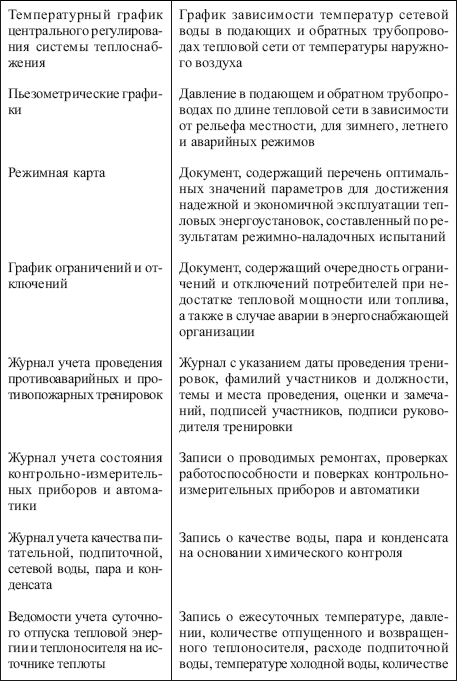 ПРИЛОЖЕНИЯ Приложение 1 Рекомендации по учету собственником тепловых энергоустановок 1. Все тепловые энергоустановки учитываются собственником (эксплуатирующей организацией) в Книге учета тепловых энергоустановок организации (далее книга учета). 2. Книга учета ведется единой для организации в целом и по подразделениям, по следующим разделам: теплогенерирующие энергоустановки; системы транспорта и распределения тепловой энергии; теплопотребляющие энергоустановки. Рекомендуемая форма Книги учета приведена ниже. Каждой тепловой энергоустановке собственником при учете присваивается номер. В графе «Примечание» указываются сведения о смене собственника, реконструкции, утилизации и т. п. 3. Для организации и ведения учета тепловых энергоустановок распорядительным документом руководителя организации назначается ответственное лицо и его заместитель (на периоды длительного отсутствия). 4. Снятие с учета тепловых энергоустановок, учитываемых собственником (эксплуатирующей организацией), производится ответственным лицом организации в случаях: передачи тепловой энергоустановки другому собственнику (эксплуатирующей организации); вывода тепловой энергоустановки из эксплуатации, ее демонтажа и складского хранения энергоустановки, ее элементов или элементов сети; снятия тепловой энергоустановки с баланса организации. В этом случае на основании подтверждающего документа делается запись в Книге учета, копия документа вкладывается в паспорт тепловой энергоустановки, которая передается другому собственнику или хранится вместе с тепловой энергоустановкой. В случае снятия тепловой энергоустановки с баланса организации и ее утилизации паспорт указанной тепловой энергоустановки может быть снят с хранения. 5. При учете теплогенерирующих энергоустановок в органы государственного энергетического надзора представляются следующие данные: наименование собственника; тип и количество теплогенерирующих энергоустановок; производительность; вид топлива (основное, резервное); количество потребителей, общая подключенная нагрузка. При реконструкции с изменением мощности теплогенерирующей энергоустановки и смене собственника для повторного учета в органах государственного энергетического надзора предоставляются данные в полном объеме, в срок не менее 10 дней. Книга учета тепловых энергоустановок организации (рекомендуемая форма) Тепловые энергоустановки предприятия (организации) ![]() Приложение 2 (образец) Журнал проверки знаний Правил технической эксплуатации тепловых энергоустановок ![]() Приложение 3 (образец) Форма удостоверения проверки знаний ![]() Приложение 4 Примерный перечень эксплуатационной документации ![]() ![]() ![]() ![]() Приложение 5 (образец) Паспорт тепловой сети ![]() ![]() ![]() ![]() Приложение 6 (образец) Паспорт теплового пункта ![]() ![]() ![]() Приложение 7 (образец) Паспорт цилиндрического вертикального резервуара ![]() ![]() Приложение 8 (образец) Паспорт подкачивающей насосной станции ![]() ![]() ![]() ![]() Приложение 9 (образец) Паспорт вентиляционной системы ![]() ![]() ![]() ![]() |