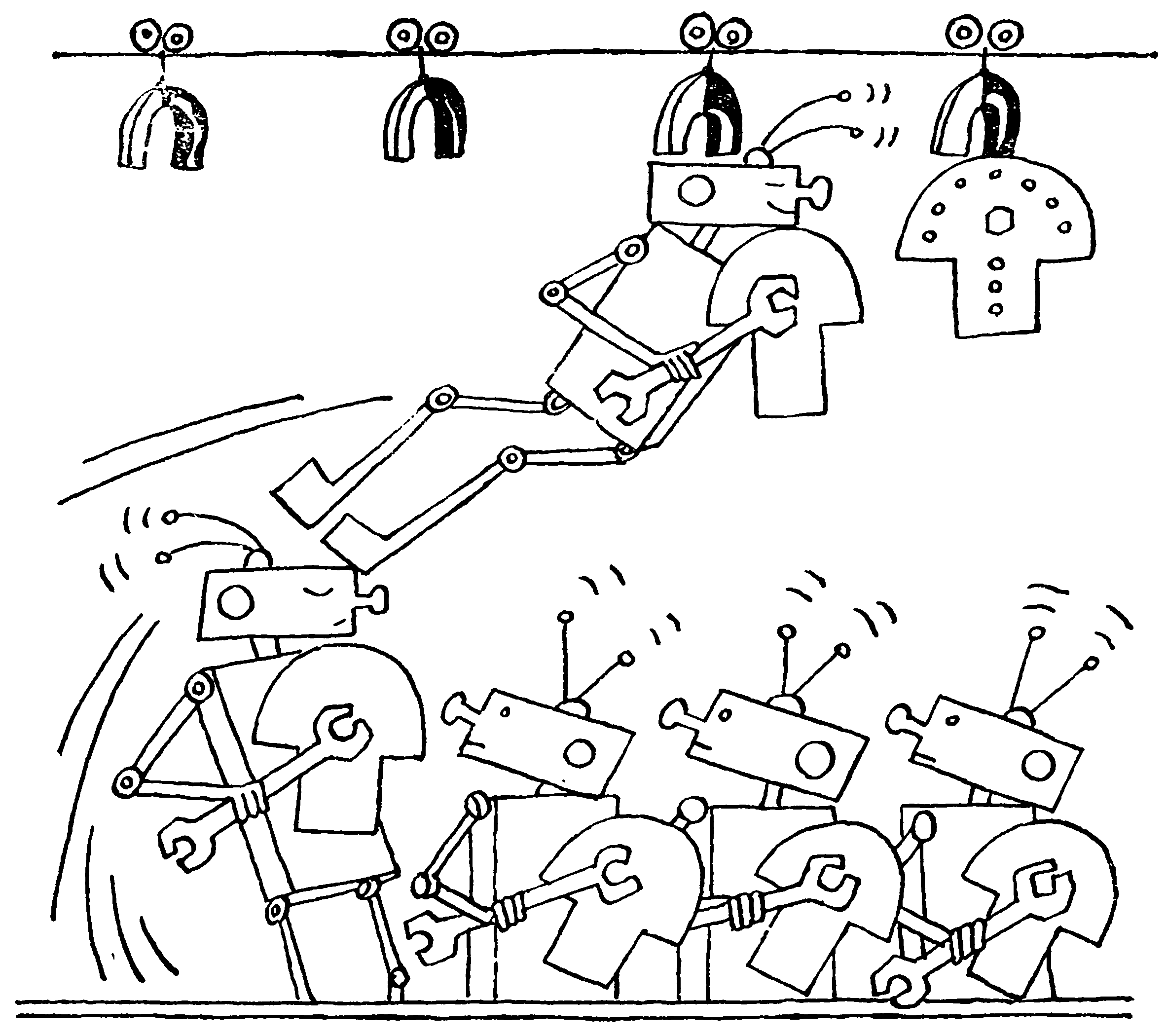 Бесчувственный робот У конвейера и станка Вы видели когда-нибудь, как работает сборочный конвейер на автомобильном заводе? Как движется вдоль линии длиной в добрый километр с лишним сначала один только кузов автомобиля, как он по дороге обрастает десятками, сотнями, тысячами узлов, деталей, как со всех сторон, с боков и сверху на тележках и противнях, по транспортерам, установленным на полу, подвешенным к потолку, укрепленным на колоннах, поступают на сборку двигатели, трансмиссии и колеса, болты, гайки и прокладки, стекла, сиденья и задние мосты, рычаги, муфты, трубки? Не имеет смысла перечислять здесь и малую долю из сотен названий всего того, что нужно, чтобы с конвейера в конце концов сошел готовый автомобиль. Минута — автомобиль, еще минута еще автомобиль, автомобиль, автомобиль… Вы были на таком конвейере? Ну тогда вы, конечно, видели, что автомобиль собирают люди, много людей — операторов-сборщиков. Весь процесс сборки до самой мелочи расписан и "разрублен", поделен на операции, каждая операция поручена отдельному оператору, иногда двум операторам. "Минута — автомобиль" означает, что каждую минуту человек должен начать порученную ему операцию, а по истечении минуты закончить ее. Конвейер это вам не мастерская средневекового часовщика, который все делал сам. На конвейере специализация: минута — операция, еще минута — еще операция. Прошло два часа — десять минут отдыха, а затем: минута — операция, еще и еще. За минуту много не сделаешь. Можно установить пару колес, надев их на шпильки и затянув гайки; можно присоединить рычаги педалей газа и тормоза; можно протереть стекла салона, поставить сиденье… Каждая операция рассчитана на то, чтобы человек мог ее выполнить за минуту. Двигатели и колеса, кузова и задние мосты пришли на главный конвейер с других конвейеров, где их собирали из отдельных узлов и деталей. И там процессы сборки поделены на сравнительно простые, короткие операции: минута или две — операция, еще минута — операция… И там эти операции тоже выполняют люди — сборщики. Узлы и детали, поступившие на сборку, были изготовлены в цехах автомобильного завода и на других заводах: электроаппаратуры и пластмасс, резиновых изделий и стекла. А процессы их изготовления тоже "разрублены" на простые, короткие операции. Так же обстоит дело на заводах, где производят мотоциклы и велосипеды, телевизоры и радиоприемники, швейные машины и книги. И там процессы изготовления деталей и сборка узлов и изделий поделены на операции, на более короткие или менее короткие. Но, конечно, современное производство не средневековая мастерская, где все делалось руками. В наше время основную, тяжелую, трудоемкую работу по изготовлению деталей и изделий делают машины и автоматы. Однако невозможно построить одну такую машину или автоматическую линию, которая бы изготовила часы целиком, с начала до конца, совершенно без участия человека. Именно поэтому технологические процессы изготовления изделий, как и процессы сборки, поделены на операции, которые выполняют то люди, то машины. Теперь часы, все их части и детали проходят через десятки, сотни машин и рук, так же как через сотни машин и рук проходят детали и узлы автомобиля, телевизора, пылесоса. Миллионы разных деталей нужно обработать, миллионы разных операций нужно выполнить; обработать и выполнит