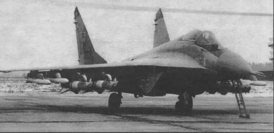 МиГ-29 Экипаж 1 чел. МиГ-29 - один из наиболее совершенных в мире истребителей четвертого поколения. К его созданию приступили на рубеже 1960-1970-х годов, когда советским ВВС потребовался легкий фронтовой истребитель (ЛФИ), предназначенный для замены самолетов МиГ-21 и МиГ-23. Новый самолет был призван противостоять таким противникам, как американские истребители четвертого поколения Макдоннелл-Дуглас F-15 и F/А-18, а также Локхид F-16. Работы по формированию облика самолета нового поколения были начаты в ОКБ А.И. Микояна в сотрудничесгвс с ЦАГИ в 1969 г. Уже на первом этапе была отвергнута аэродинамическая компоновка по схеме «бесхвостка» и был сделан выбор в пользу нормальной аэродинамической схемы. В результате большого объема теоретических и экспериментальных работ к началу 1971 г. была сформирована концепция высокоманевренного истребителя с высокой (›1) тягово-оруженностью, имеющего «интегральную» компоновку. Тактико-технические требования к ЛФИ были выпущены ВВС в 1972 г., а техническое проектирование нового самолета началось в 1974 г. Основными задачами машины являлись: завоевание превосходства в воздухе (уничтожение истребителей противника в ходе высокоманевреннъгх воздушных боев); борьба со средствами воздушного нападения, угрожающим войскам и объектам, расположенным на линии фронта; уничтожение разведывательных самолетов, самолетов ДРЛО и РЭБ; сопровождение ударных самолетов; противодействие всем средствам воздушного наблюдения противника. Дополнительными задачами являлись ведение воздуш-I юй разведки, а также уничтожение при помощи свободно-падающих бомб, НАР и пушки наземных и морских малоразмерных целей. МиГ-29 наряду с МиГ-31 стал первым самолетом ОКБ АН. Микояна с двухконтурными турбореактивными двигателями Он явился, также, первой принципиально новой машиной, созданной под руководством генерального конструктора РА Белякова (после кончины в 1970 г. А.И. Микояна - одного из основателей ОКБ). Первый из 11 построенных опытных самолетов «9-12» совершил первый полет 6 октября 1977 г. (летчик-испытатель А В Федотов), серийное производство истребителей началось в Москве в 1982 г. Первые 30 серийных машин имели в хвостовой части аэродинамические гребни, впоследствии упраздненные. Строился, также, экспортный вариант самолета «9-12» - ислребитель «9-12Б». 29 апреля 1981 г. начались летные испытания двухместного учебно-боевого самолета «9-51», запущенного в 1985 г в серийное производство на Горьковском авиационном заводе под обозначением МиГ-29уБ. 4 мая 1984 г. начались летные испытания истребителя МиГ-29 «9-13», имеющего гаргрот увеличенных размеров, в котором размещалось дополнительное БРЭО (в частности, аппаратура РЭБ) и топливо. Самолет получил два подкрылье-вых ПТБ (2 х 1150 л), что, в сочетании с подфюзеляжным ПТБ, позволило достичь перегоночной дальности 2900 км Бомбовая нагрузка самолета «9-13» возросла, по сравне!гию с «9-12»,с20б0до3000кг. Для ВВС Малайзии серийно строился истребитель МиГ-29Н, имеющий усся^ршенствованную БРЛС Н0-193 М, дополнительную радиостанцию с пультом плавной настройки, а также ряд элементов БРЭО западной разработки (в частности, приемники системы ближней радионавигации TACAN и системы инструментального захода на посадку VOR-ILS, блок спутниковой навигации GPS) В состав вооружения включены УР РВВ-АЕ В ходе доработки на эти самолеты устанавливаются 