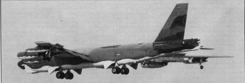 Б-52 Стратегический чемпион по активному долголетию Продолжение. Начало в № 1/2001 Бортовое оборудование и вооружение стратегических бомбардировщиков В-52 совершенствовалось на протяжении всего срока их службы. В 1971-1977 гг. на всех самолетах B-52G/H была установлена опто-элек- тронная обзорная система AN/ASQ- 151, значительно повысившая боевые возможности самолета в ночных условиях, а также при использовании противником ядерного оружия (телевизионная аппаратура в сочетании со специальными шторками препятствовала ослеплению летчиков при ядерном взрыве). С 1985 г. началось оснащение части самолетов B-52G приемниками спутниковой навигационной системы NAVSTAR. В 1981-1990 гг. на всех самолетах B-52G/H в рамках программы OAS осуществлена работа по модернизации наступательных радиоэлектронных систем. В начале 1970-х годов вместо ракет "Хаунд Дог" в роли средства огневого подавления ЗРК были приняты ракеты SRAM, а в начале 1980-х годов на вооружении появились крылатые ракеты ALCM, значительно улучшившие возможность нанесения ударов без захода в зону ПВО противника. Однако такой способ атаки стал стандартным лишь в 1990-х годах после того как стратегические бомбардировщики Рокуэлл В-1В достигли состояния боеготовности; в 80-е годы типовое задание предусматривало использование КР для подавления ПВО противника с последующим прорывом для нанесения ядерного удара с применением свобод- нопадающих бомб или ракет SRAM. В 1984-1990 гг. 195 бомбардировщиков (99 B-52G и 96 В-52Н) были модернизированы для установки 12 (по шесть на каждом подкрыльном пилоне) крылатых ракет Боинг AGM-86B с ядерной БЧ. В 1988-1993 гг. 96 самолетов В-52Н получили еще восемь КР AGM-86B на унифицированной многопозиционной внутрифюзеляжной пусковой установке (таким образом, один самолет В-52Н получил способность нести до 20 КР). В конце 1980-х вооружение было дополнено КР AGM- 86С, оснащенными неядерными БЧ. Бомбардировщик В-52Н получил на вооружение также малозаметные стратегические КР AGM-129 (на многопозиционной ПУ в фюзеляже – четыре ракеты и еще 12 КР на внешних узлах подвески). В конце 1980-х годов 69 самолетов B-52G, не прошедшие модернизацию под стратегические крылатые ракеты, были перенацелены на доставку неядерного оружия. В 1988 г. семь самолетов B-52G оснастили противокорабельными УР AGM-84 "Гарпун" (до 12 на внешней подвеске), минами или (для поражения наземных целей) высокоточными УР израильской разработки AGM-142 "Рэптор" (израильское наименование – "Поп Ай"). Парк одновременно находившихся на вооружении самолетов В-52 достиг максимума в начале 1960-х гг. и насчитывал значительно более 600 бомбардировщиков. В 1965-1984 гг. варианты с В-52В по B-52F были сняты с вооружения. К началу 1992 г. на вооружении ВВС США оставалось 254 самолета В-52 (159 B-52G и 95 В-52Н), из них 33 B-52G были на постоянной основе перенацелены на выполнение неядерных задач с применением обычных бомб и противокорабельных ракет "Гарпун". 3 марта 1992 г. с американской авиабазы Барксдейл (шт. Луизиана) взлетели два самолета B-52G, взявшие курс на Россию. Через 12 часов, пройдя Атлантический океан и дозаправившись топливом в воздухе над Англией от сопровождавшего их танкера КС-10А, они оказались в самом сердце России – над Рязанью. Так спустя 40 лет после своего создания стратегический бомбардировщик В-52 впервые совершил перелет, для осуществления которого он предназначался. Однако самолеты В-52, появившиеся в росси