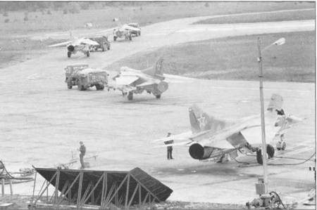 Истребитель- бомбардировщик МиГ-27 Б. Марковский, И. Приходченко Продолжение. Начало в № 9-12/2003, 1-3/2004 г. Взлет по тревоге Вступая в строй 1976 год стал началом массовой эксплуатации МиГ-27 в ВВС. Вслед за лидерным полком новая машина стала поступать на вооружение других частей ИБА. В ноябре того же года Приказом ГШ ВВС прошло переименование частей и соединений ИБА: сохранив прежние номера и подчиненность, истребительно-бомбардировочные полки и дивизии (ибап и ибад) сменили аббревиатуры на более благозвучные апиб и адиб. В числе первых МиГ-27 получили части западного направления – по заведенному порядку, развернутые в странах Варшавского Договора силы, противостоящие НАТО, требовали оснащения новейшей техникой в первую очередь. Оперативными планами Генштаба территория ГДР, Польши и Чехословакии рассматривалась как часть Западного ТВД, во втором эшелоне включавшего также БелВО и ПрибВО. Соответственно, в мирное время части 16-й ВА, развернутой в ГДР при более чем полумиллионной ГСВГ, объединялись в два авиакорпуса – северный, со штабом в Виттштоке и южный, со штабом в Виттенберге. В случае войны, с учетом предполагаемых действий на широком фронте Западного направления европейского театра войны, силы ГСВГ входили в состав соответствующих фронтов, включавших наземные и авиационные силы, а 16-я ВА усиливалась и разделялась на две армии, насчитывавшие по четыре авиадивизии. Их дополняли соединения ВВС и ПВО ГДР, имевшие в своем составе две дивизии. Мощь развернутых на Западном направлении армий была впечатляющей – по оценке командования, их сил было достаточно для того, чтобы с началом боевых действий в течение недели сломить сопротивление противника и выйти на рубеж Ла-Манша (за что группировку так и звали "Ла- Манш"). Ударные силы 16-й ВА (ИБА и ФБА) дислоцировались на востоке ГДР, что давало некоторый выигрыш во времени на выход из-под удара и рассредоточение (размещение аэродромов не было секретом для потенциального противника, тем более, две трети их находились на месте бывших баз люфтваффе). Фронтальную защиту от воздушного нападения обеспечивали истребители, размещавшиеся на аэродромах вдоль границы с ФРГ. Всего армия располагала 46 аэродромами и 15 полигонами отработки боевого применения. Штаб 16-й ВА располагался в военном городке Вюнсдорф под Берлином. Первыми в 1976 году МиГ-27 получили авиаполки 105-й дивизии истребителей-бомбардировщиков, дислоцированные на землях Саксонии в южных округах ГДР – 559-й апиб в Финстервальде и 296-й апиб в Альтенбурге (здесь же находился и штаб дивизии). Следом МиГами перевооружили 19-й гв. апиб 125-й Краснознаменной дивизии в Лерце, на севере страны, где освоение новой матчасти также шло "под крылом" находящегося в этом гарнизоне штаба соединения. Три других полка этих дивизий получили Су-17. Техник следит за выруливанием своего МиГ 27 День полетов на аэродроме Смуравьево. После полетов МиГи буксируются в укрытие. В качестве тягачей используется "подручный" автотранспорт, включая АПА, УПГ и топливозаправщики МиГ-27 готовится к буксировке с помощью АПА-5М Развернутые в Польше Северная группа войск (СГВ) и ее 4-я ВА (до 4 апреля 1968 года – 37-я ВА) имели более скромные масштабы, выполняя роль "горячего резерва" по усилению передовой группировки. Компактно расположенные силы 4-й ВА находились непосредственно у западных 