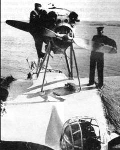 Летчик МБР-2ВУ из отдельного отряда волнового управления Военные модификации Сразу после принятия МБР-2 на вооружение начались работы по использованию его в качестве самолета-водителя радиоуправляемых торпедных катеров (чаще их называли катерами волнового управления – ВУ). Уже в 1934 г. балтийцы опробовали МБР-2 на пригодность для службы в таком амплуа и отметили, что шестичасовой продолжительности полета новой летающей лодки вполне достаточно для целей волнового управления, однако, чтобы облегчить работу оператора катера, необходимо изменить расположение передней турели и установить новые жесткие радиоантенны. Потребность Морских Сил в таких самолетах определялась в 19 единиц. Специальный вариант, оснащенный аппаратурой волнового управления «Спрут», размещенной в третьем отсеке лодки, получил обозначение МБР-2ВУ. Его экипаж увеличили до пяти человек, пополнив двумя операторами. Первые две такие машины (№№31004 и 31008) переоборудовали летом 1935 г. на Балтике. С запуском в серию МБР-2-М-34 вариант ВУ строился на его базе. Одновременно продолжалось совершенствование аппаратуры волнового управления. Так, в 1938 г. на вооружение была принята система «Вольт-Р». Самолетная часть аппаратуры включала в себя приборы «Кварц-3», «Кварц-4», «Топаз-3» и «Вольт-Р». Производство МБР-2 шло полным ходом, а военные все настойчивее говорили об устарелости самолета. Для его замены ЦКБ МС разрабатывало новый разведчик МБР-7, однако его доводка затягивалась, и тогда возникла идея улучшить летные характеристики МБР-2, установив на него силовую установку от МБР-7. V-образный 12-ти цилиндровый двигатель водяного охлаждения М-103 (форсированный вариант М-100А), развивавший на взлетном режиме 850 л.с., был мощнее и легче АМ-34НБ, а также имел меньший «лоб». Он оснащался металлическим 3-х лопастным винтом ВИШ-2ПТ диаметром 3,25 м с двумя установочными углами лопастей. Двигатель размещался на подмоторной раме, аналогичной по конструкции серийным МБР-2. Система охлаждения масла была перенесена с МБР-7, а в топливной системе вместо насоса-ветрянки применили бензопомпу БНК-5УБ. В остальном самолет ничем не отличался от МБР-2-АМ-34. В МБР-2-М-103 переоборудовали одну из серийных летающих лодок, которая уже в ноябре 1939 г. была передана на совместные летные испытания. Они проходили в два этапа: с 14 по 27 ноября 1939 г. в Таганроге, а затем с 27 ноября по 19 февраля 1940 г. в Севастополе. Ведущим летчиком-испытателем был к-н И.М.Сухомлин. Кроме него, в экипаж входили штурман ст. л-т Данилов и бортгехник воентехник 1 ранга Алферов. Всего на МБР-2-М-103 выполнили 50 полетов с общим налетом в 35 ч 30 мин. По результатам испытаний было отмечено, что самолет обладает лучшими характеристиками, чем серийные МБР-2, превосходя их по максимальной скорости, скороподъемности, потолку и некоторым другим характеристикам. Отмечалось, что эксплуатация МБР-2-М-103 не имеет особых отличий от МБР-2-АМ-34НБ и не требует новых средств оборудования гидроаэродромов. Пилотажные характеристики самолета также сильно не изменились, но испытатели указали, что для управления им требуется больше внимания, особенно на взлете, виражах, планировании и при разворотах. Мореходность МБР-2-М-103 не изменилась. Запуск М-103 оказался значительно легче, чем АМ-34НБ, особенно при низких температурах. Однако винтомоторная группа была не доведена (сказались сж