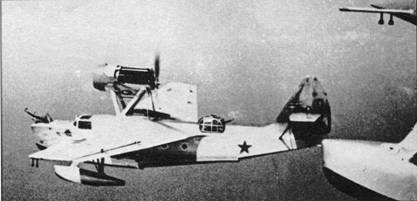 В строевых частях морской авиации МБР-2 заменили гидросамолеты старых типов Кроме рутинной боевой работы, выпадали на долю МБР- 2 и необычные операции. Так, в сентябре 1944 г. МБР-2 пришлось вывозить экипаж английского «Ланкастера», участвовавшего в операции «Параван» (удар по линкору «Тирпиц»), При перелете из Великобритании экипаж флаинг-офицера Кили не дотянул до аэродрома Ягодник под Архангельском и после выработки топлива посадил свой самолет на «брюхо» прямо в болото в районе деревни Талаги. Чтобы вытащить англичан из этой глухомани, пришлось сбрасывать на парашюте проводника, который вывел их к ближайшему озеру, где ожидал МБР-2. 20 октября немецкий гидросамолет BV 138 из 1./SAG 130 по техническим причинам совершил вынужденную посадку в районе о. Моржовец. Экипаж «летающего башмака» стал запрашивать помощь по радио, но работа неизвестной радиостанции только привлекла внимание наших моряков. Вылетевший в тот район МБР-2 обнаружил своих незадачливых коллег и навел на BV 138 гидрографическое судно «Мгла», экипаж которого захватил самолет и пленил немцев. Свою лепту в победу на Севере внесли и «амбарчики» ГВФ. В первые дни войны в Архангельске создали Карело-финскую особую авиагруппу ГВФ, в ноябре 1942 г. преобразованную в 5-й отдельный полк ГВФ, действовавший на Карельском фронте. В состав ВВС Ленинградского фронта входил 4-й полк ГВФ. В обеих частях воевали более 10 гидросамолетов МП-1 и МП-1 бис. Их основной задачей стала поддержка связи с партизанами. Летающие лодки сотни раз вылетали во вражеский тыл, где садились на многочисленные озера, доставляя боеприпасы, оружие, продовольствие и медикаменты. Над Балтикой К лету 1941 г. в ВВС КБФ насчитывался 151 МБР-2, входивший в состав 15-го морского разведывательного авиационного полка (МРАП) и 15-й, 41-й, 43-й, 44-й, 58-й, 81-й отдельных МРАЭ. Они были основными самолетами-разведчиками Балтфлота и практически единственными, оснащенными аэрофотоаппаратами. Большинство экипажей имело подготовку к полетам в сложных метеоусловиях и ночью, что делало МБР-2 «самолетом для плохой погоды» и позволяло за счет правильной тактики рассчитывать на его успешное боевое применение. Балтийский флот с 19 июня 1941 г. находился в оперативной готовности №2. МБР-2 вели разведку районов, прилегавших к территориальным водам СССР, и первыми вступили в войну. 22 июня в 3 ч 30 мин летающие лодки ст. л-та Трунова и л-та Пучкова из 44-й ОМРАЭ, вылетев из Таллина, обнаружили в Финском заливе группу неизвестных кораблей. Снизившись до 600 м, самолеты взяли курс на них и были встречены зенитным огнем. Это оказался отряд немецких минных заградителей, возвращавшихся на базу. С первых дней войны «амбарчики» использовались для поддержки сухопутных войск. 22 и 23 июня самолеты 43-й эскадрильи, базировавшейся на озере Дурбе в 40 км от Либавы, помимо обеспечения развертывания подводных лодок из Либавы в Балтику и прикрытия минных постановок, совершили более 100 вылетов на поддержку войск, оборонявших город. Сил 43-й эскадрильи оказалось явно недостаточно, но больше флот выделить не мог. К исходу 23 июня немцы замкнули кольцо вокруг Либавы, их танки вышли к Дурбе, и 43-й эскадрилье пришлось срочно перебазироваться на озеро Киш вблизи Риги. Оттуда экипажи этой части и 41-й ОМРАЭ продолжали наносить удары по наступавшим войскам противника вплоть до сдачи Риги 30 июня. Опе