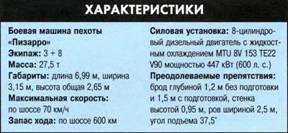 Вверху. Боевая машина пехоты CV 9040, состоящая на вооружении шведской армии, представляет собой классическую БМП настоящего времени во всем, за исключением калибра основного вооружения, который превосходит аналогичную характеристику большинства других современных БМП. Эта 40-мм пушка компании «Бофорс» имеет углы вертикальной наводки от -8° до +35°. Боекомплект пушки составляет 238 выстрелов, а 7,62-мм спаренного с ней пулемета - 3000. В течение многих лет основным бронетранспортером шведских сухопутных войск был Pbv 302 фирмы «Хегглунд унд Зонер», оснащенный одноместной башней с ручным приводом и 20-мм пушкой. Министерство обороны Швеции разработало требования к боевой машине пехоты, которая дополнила бы Pbv 302 в боевых порядках. Контракт на ее разработку был выдан небольшой фирме «НВ Утвек- линг», которая привлекла к работе в качестве субподрядчиков компании «Хегглундз викл» (ходовая часть) и «Бофорс» (башня и вооружение, окончательная сборка). После испытаний прототипов был заключен контракт на поставку этих машин шведской армии (первая поступила в 1993 году). К 2002 году было построено почти 700 машин разных модификаций. Базовая модификация CV 9040 оснащена двухместной башней с 40-мм пушкой 40/ 70В компании «Бофорс дифенс», которая заряжается с казенной части и имеет систему выброса пустых гильз через крышу. Пушка 40/70В представляет собой модификацию знаменитой 40-мм зенитной пушки L/70 и может вести огонь различными типами боеприпасов, включая бронебойные подкалиберные оперенные снаряды с отделяющимся поддоном, трассирующие и фугасные. С пушкой спарен 7,62-мм пулемет М/39. Цифровая система управления обеспечивает ведение огня в дневное и ночное время. Также на машине установлены французские гранатометы фирмы «Галикс», применяющие гранаты различных типов, в том числе дымовые. Экипаж состоит из водителя, командира и наводчика. В десантном отделении в кормовой части машины размещаются восемь полностью экипированных пехотинцев (по четыре человека вдоль бортов лицом внутрь). Доступ в отделение и спешивание осуществляются через кормовую аппарель. На вооружении шведской армии состоят машины, созданные на базе БМП CV 9040, в том числе командно-штабная CV 90 FCV, разведывательная CV 90 FOV и ремонтно- эвакуационная CV 90 ARV машины, а также самоходная зенитная установка TriAD с башней от CV 9040, на которой установлен обтекатель антенны РЛС «Тейлс». В течение нескольких лет все состоящие на вооружении БМП прошли несколько этапов модернизации и получили обозначение CV 9040А или CV 9040В. В ходе последних этапов модернизации было усилено бронирование корпуса и башни. Большая работа была проведена также по усилению днища корпуса для защиты от воздействия взрывов противотанковых мин, что особенно было важно при проведении миротворческих операций на Балканах. В будущем шведская армия планирует приобрести еще одну версию CV 90, оснащенную башней с двумя спаренными 120-мм минометами (AMOS - Advanced MOrtar System), которая уже демонстрировалась на ряде других шасси, колесных и гусеничных. По собственной инициативе компания «Хегглундз викл», которая в конце 2002 года стала называться «Элвис хегглундз», разработала БМП CV 9030 с использованием шасси CV 9040 и башни собственной разработки, вооруженной американской 30-мм пушкой компании «АТК ган систеМ3». Первым покупателем этой машины стала Норвегия, которая 