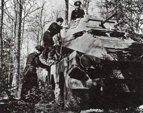 Справа. Экипаж садится в бронеавтомобиль SdKfz 231 «Ахтрад». Судя по характерным беретам, надетым поверх защитных кожаных шлемов, фотография была сделана перед войной или в Польше, так как к 1940 году такие береты отменили. |