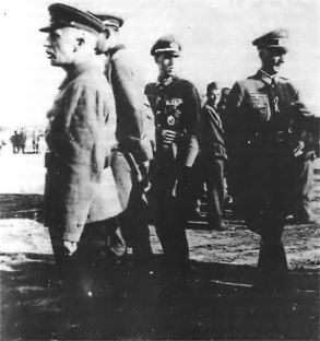 Присяга легионеров, крайний справа — мулла Некоторое время спустя последовало уточнение: вступающие в легионы представители восточных народов до принятия присяги должны были давать подписку о добровольности своего вступления и о своих обязанностях (этого требовала директива Генштаба от 22 ноября 1942 г.).[130] Итак, подробные правила для Восточных легионов были приняты. Летом—осенью 1942 г. оформление их на территории Польши было фактически закончено. Были созданы: 1. Туркестанский легион. Согласно немецким предписаниям, к нему приписывались узбеки, казахи, туркмены, таджики, киргизы, белуджи, дунгане, иранцы, кашгарцы, шугнанцы, таранчинцы, курамины и восточные татары (?). 2. Кавказско-мусульманский (позднее — Азербайджанский) легион — азербайджанцы. 3. Северо-кавказский легион — абхазцы, адыгейцы, черкесы, кабардинцы, балкарцы, карачаевцы, чеченцы, ингуши, кумыки, ногайцы, аварцы, ахвахи, андийцы, багулалы, ботлихи, хваршины, дидойцы, годоберийцы, каратинцы, тиндалы, чамалинцы, даргинцы, кайтаги, кубачинцы, лаки, лезгины, агульцы, цахурцы, рутульцы, табасаранцы, удины, курды, талыши, таты, северные осетины. 4. Грузинский легион — грузины, аджарцы, гурийцы, имеретинцы, кахетинцы, лазы, мингрельцы, сваны, южные осетины. 5. Армянский легион — армяне (преимущественно из Карабаха). 6. Волго-татарский легион — уфимские и казанские татары, башкиры, говорящие по-татарски чуваши, марийцы, удмурты, мордва.[131] В сентябре 1942 г. командующий военным округом в «генерал-губернаторстве» (Польше) генерал фон Гинант дал указания, где подробно расписывались правила непосредственной организации полевых батальонов. Вся ответственность при этом ложилась на командование Восточных легионов. По указанию командования батальоны формировались командирами легионов. Устанавливались следующие сроки подготовки: первый этап — в легионе, индивидуально и в группах — 4 недели; второй этап подготовки полевых батальонов — в отделении, взводе или роте — 6–8 недель. Командир должен был составить общий план по всем направлениям: отработка таких тем, как «марш», «индивидуальная подготовка», «ближний бой», «метание гранат», «бег», «скачки», «уход за лошадьми» и пр. При каждом батальоне создавалась специальная боевая школа. Подготовка проводилась вначале во дворе казарм, а затем и на местности. Во время проведения занятий легионеры должны были делиться на учебные группы из немецкого обучающего персонала и учебные взводы из немцев и легионеров. Все командиры обязаны были присутствовать на занятиях. Учения батальонов проводились только при разрешении командира Восточных легионов, при этом по возможности учениями руководил он сам.[132] Довольно долгое время проходило становление военного командования Восточных легионов. В зависимости от отношения к этим соединениям, в зависимости от конкретного опыта их использования менялись и статус, и структура этого командования. В целом же оно выглядело так. Военное руководство легионами осуществлялось из Высшего командования сухопутных войск (ОКХ), а именно из ведомства шефа по поставке вооружений и командующего запасными (дополнительными) частями — Chef des Heeresrustung und Befehlshaber des Ersatzheeres. Это была высшая инстанция, которая осуществляла руководство через командующего военным округом в «генерал-губернаторстве» — Militarbefehlshaber im Generalgouvernement. Одн