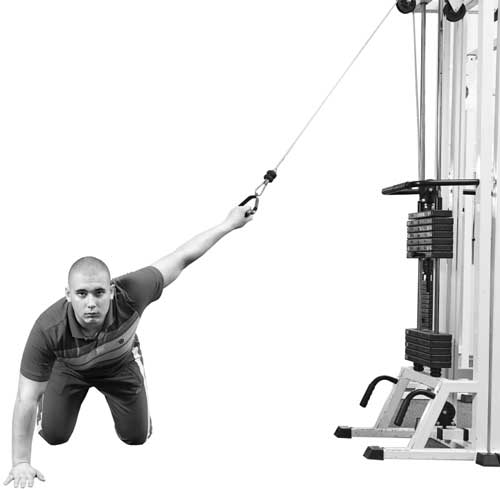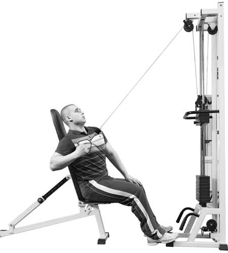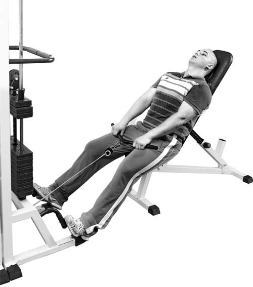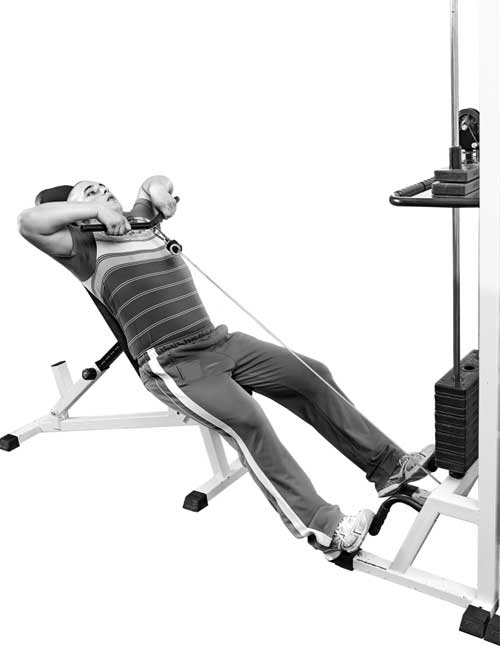 Приложение 2Упражнения лечебные и оздоравливающие с использованием МТБ[15] из группы «Б»Начинать лучше с растягивающих упражнений. Можно использовать универсальную скамью с меняющимся углом спинки и сиденья, также можно сидеть и даже лежать на полу или в И.П. стоя перед стойкой и упираясь свободной рукой в специальные опорные скобы. Я буду рассматривать варианты на универсальной скамье. Итак. 1-е упражнение из группы «Б». Тяга рукой с верхнего блока. (См. фото 1 а, б.) И.П. сидя на универсальной скамье лицом к стойке МТБ. Свободная рука опирается на колено. Рабочей рукой производим тягу за ручку с верхнего блока на выдохе «ха-а». То же самое другой рукой. Количество килограммов на тренажере и количество повторений подбираются с учетом возможности выполнения 12—15 раз в одной серии. Это правило применимо для всех последующих упражнений. Основные показания: головные боли, боли в шейном отделе, позвоночнике, руке, плече. С этого упражнения можно начинать при высоком АД в целях его снижения, хроническом (остром) бронхите. ![]() Фото 1а. ![]() Фото 1б. 2-е упражнение из группы «Б». Разгибание (жим) руки вверх с нижнего блока. (См. фото 2 а, б.) И.П. то же, но спиной к стойке МТБ. Рука согнута в локтевом суставе, кисть с ручкой у плеча. Полное разгибание руки вверх (на выдохе «ха-а»). Опустить в И.П. (чем ниже, тем лучше). Количество килограммов и повторений смотрите в упражнении №1. То же другой рукой. Допускается при опускании руки небольшой наклон туловища в сторону руки, а при разгибании руки вверх – в противоположную. Возможна болезненность в плечевом и локтевом суставах при разгибании. Основные показания: боли (острые и хронические) в плече (плечевом суставе[16]), локтевом суставе, хронические мигрени и головные боли. ![]() Фото 2а. ![]() Фото 2б. 3-е упражнение из группы «Б». Разгибание (жим) руки вниз с верхнего блока. (См. фото 3 а, б.) И.П. такое же, как в упражнении № 2, рука держит ручку тренажера, пальцы смотрят вниз. Рука согнута в локтевом суставе, поднята максимально. Разгибание руки в локтевом суставе вниз на выдохе «ха-а», при этом максимально опустить плечо со стороны рабочей руки, туловище не раскачивается. Количество килограммов и повторений смотрите в упражнении №1. Основные показания: те же, что и в упражнении № 2. ![]() Фото 3а. ![]() Фото 3б. 4-е упражнение из группы «Б». Разгибание руки (жим) вперед с нижнего блока. (См. фото 4 а, б.) И.П. аналогично №2—3. Пальцы, сжимающие ручку тренажера, смотрят вперед. Разгибание руки вперед на выдохе «ха-а». То же делаем другой рукой. Возможно ощущение болезненности при отведении плечевого сустава назад и в области грудины при разгибании руки. Это является также элементом нормы. Более резкий и, главное, длинный выдох способствует снижению интенсивности болевой доминанты. После выполнения упражнений, вызывающих локальные боли, к месту этих болей на 5—6 секунд приложить компресс со льдом. Иногда это можно позволить себе и непосредственно во время выполнения упражнения[17]. Количество килограммов и количество повторений такое же, как в №1—3. Основные показания: гипертоническая болезнь (II—III степени), ИБС с аритмией, стенокардией (обязательно выдерживать одинаковый ритм сгибания-разгибания руки), плечелопаточный периартрит в стадии «замороженного плеча», грудной остеохондроз с грыжами Шморля. ![]() Фото 4a. ![]() Фото 4б. 5-е упражнение из гру